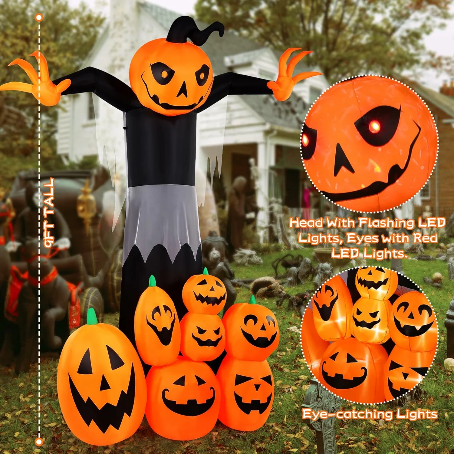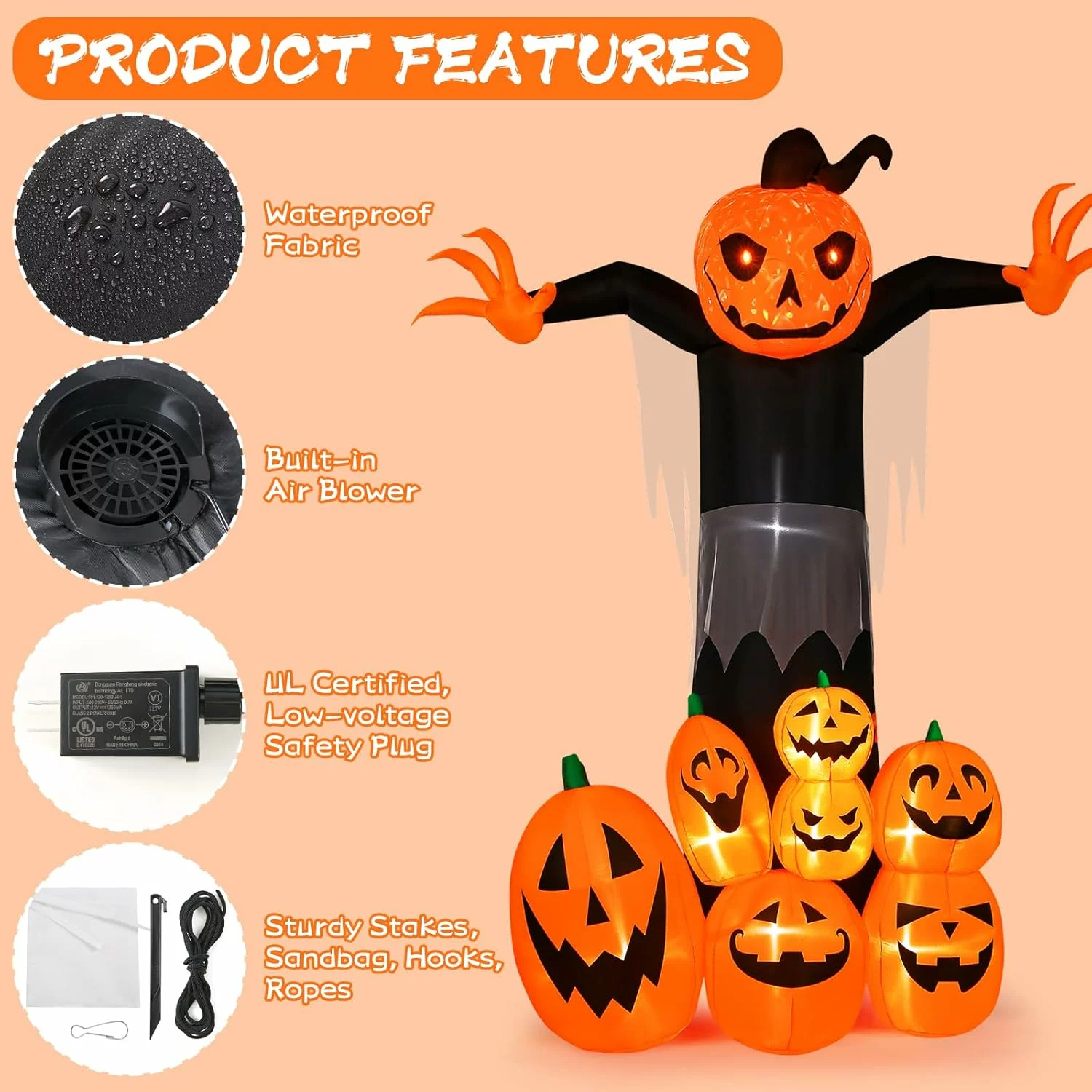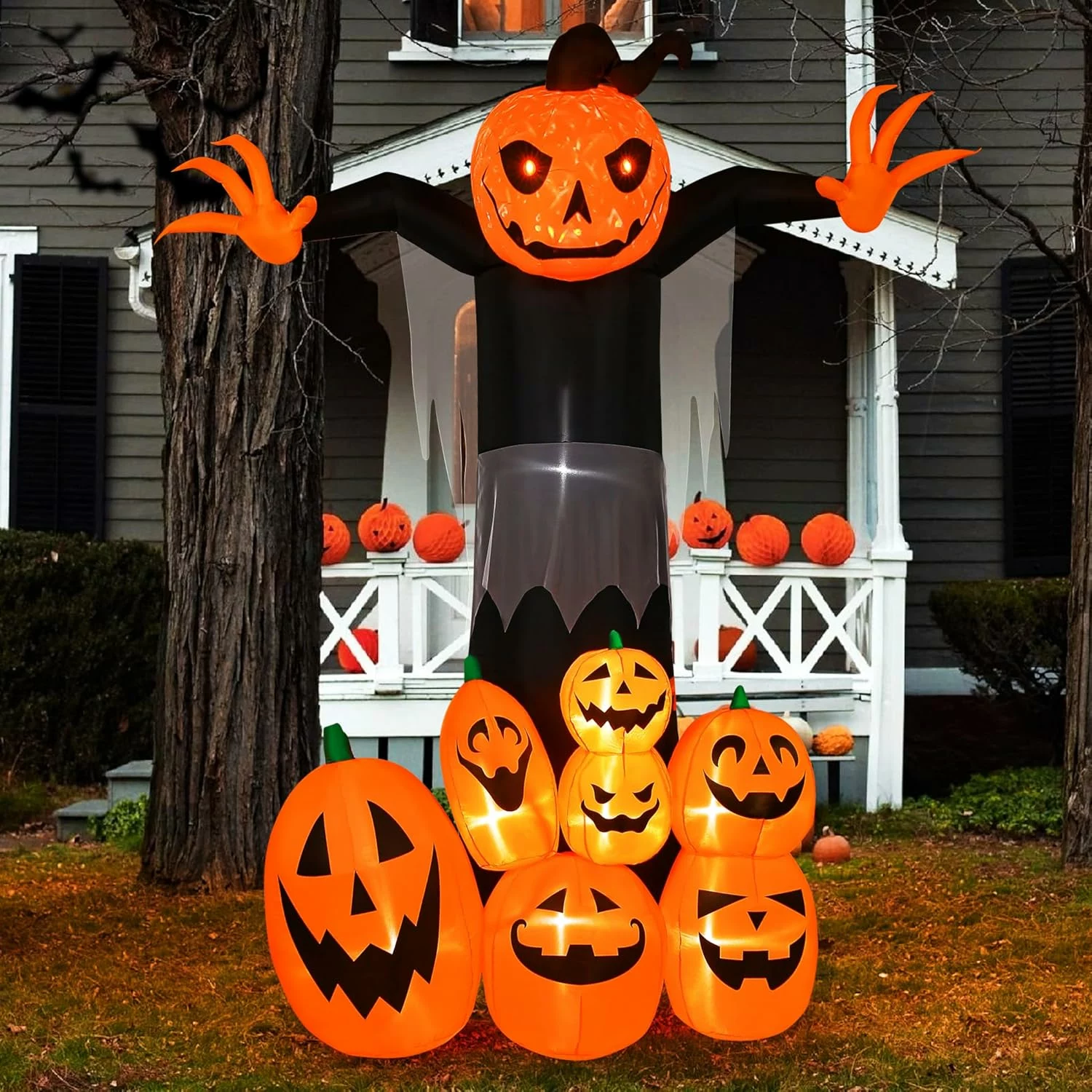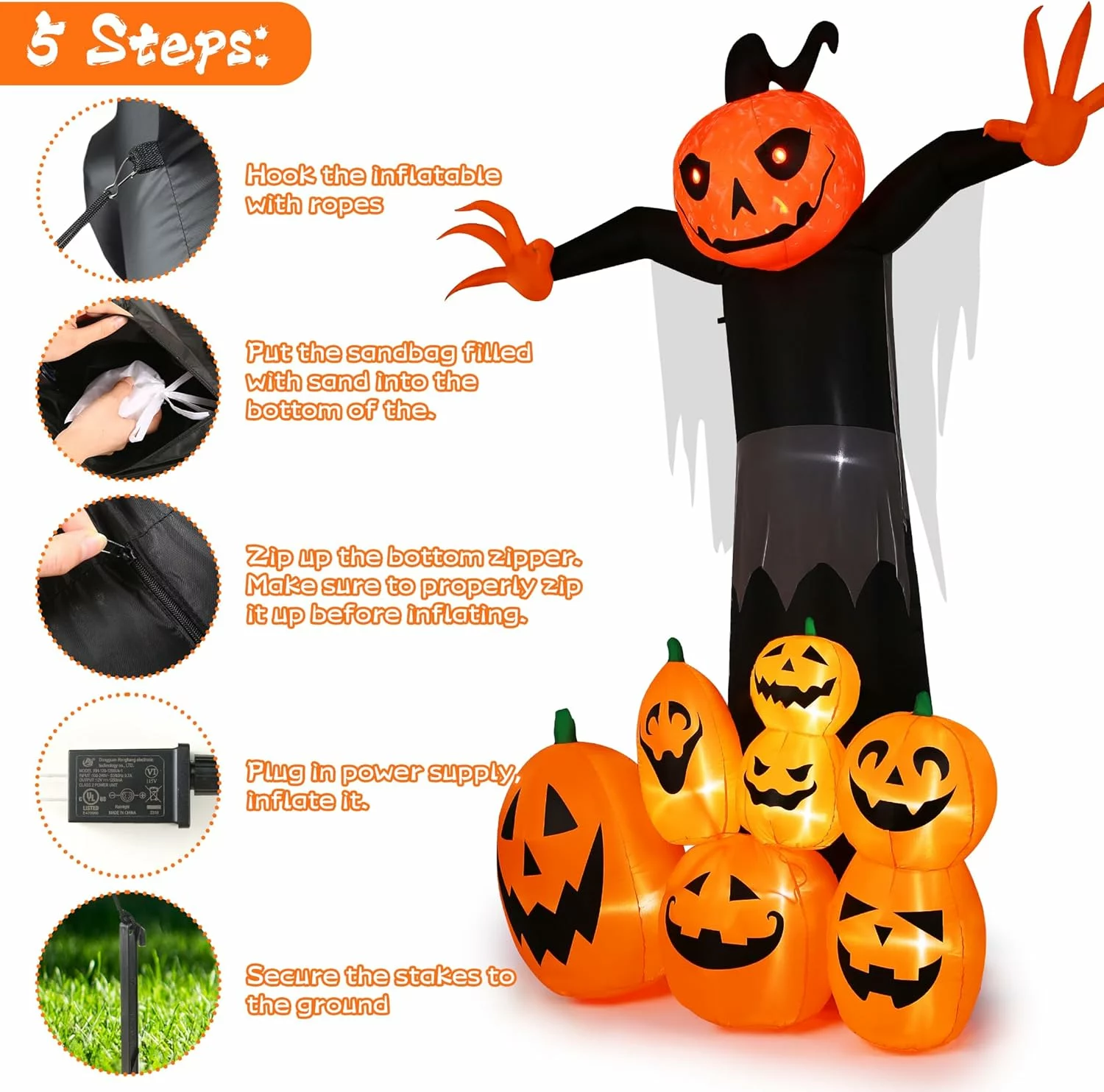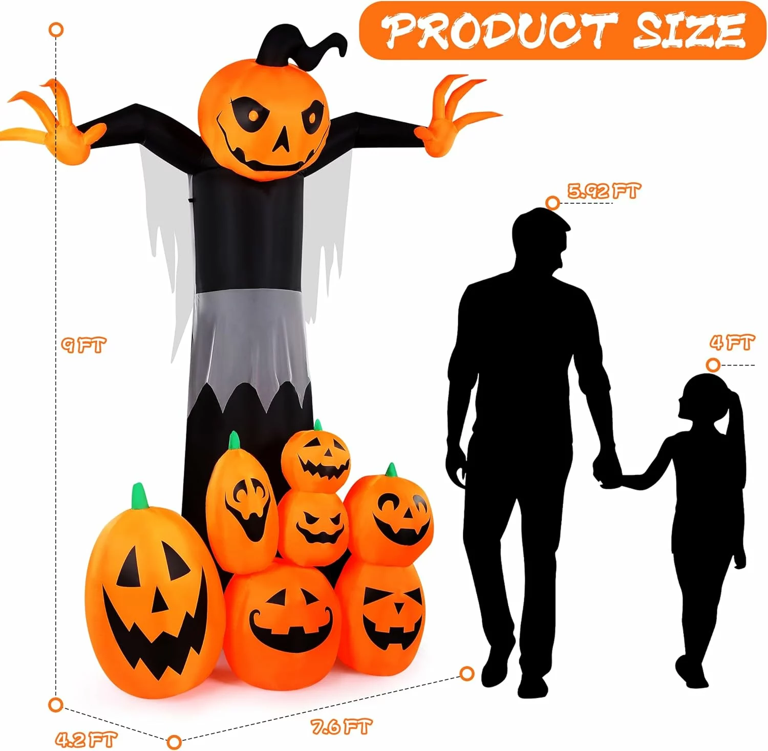 GIANT PUMPKIN REAPER INFLATABLE: Height: 9FT. Long: 7.6FT(include open hands’ size), Wide: 4.2FT. The oversized dimensions are particularly striking. It will be the finishing touch to your Halloween decorations. The best outdoor decorations for Halloween