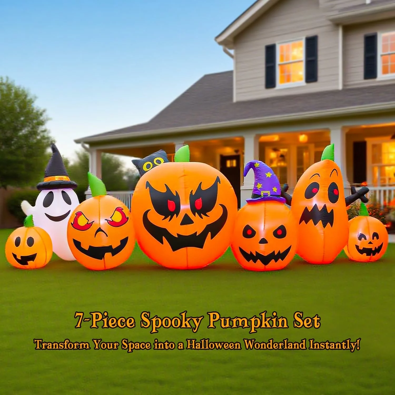 BUILT-IN 7 BRIGHT LIGHTS: 7 built-in LED lights illuminate through the inflatable pumpkin and ghost designs, casting an eerie glow to attract trick-or-treaters.