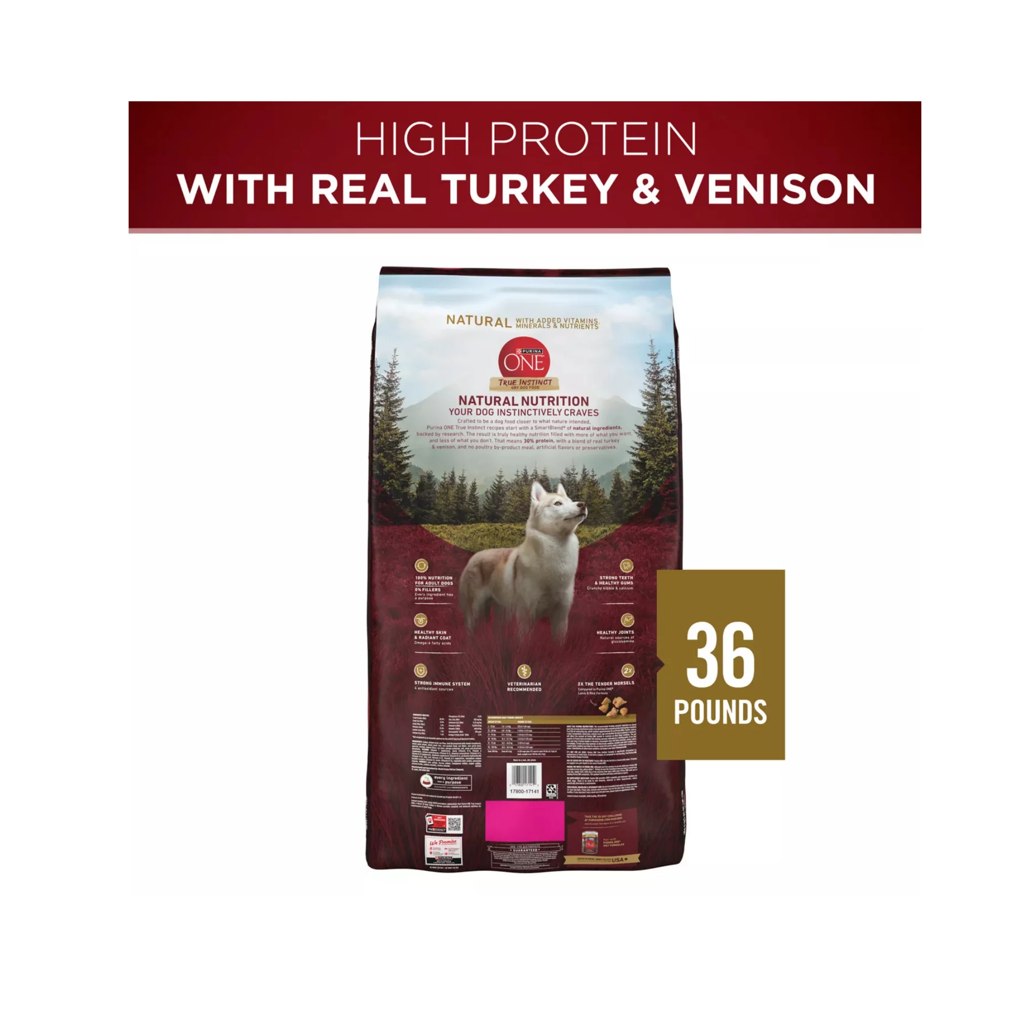 Feed your dog the high-quality nutrition nature intended with Purina ONE True Instinct With Real Turkey & Venison. This natural dry dog food is made with added vitamins, minerals, and nutrients to provide 100% complete and balanced nutrition for adult dogs — with 0% fillers, so every ingredient has a purpose.