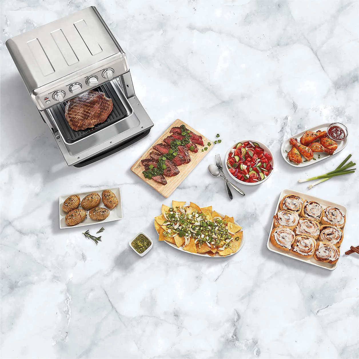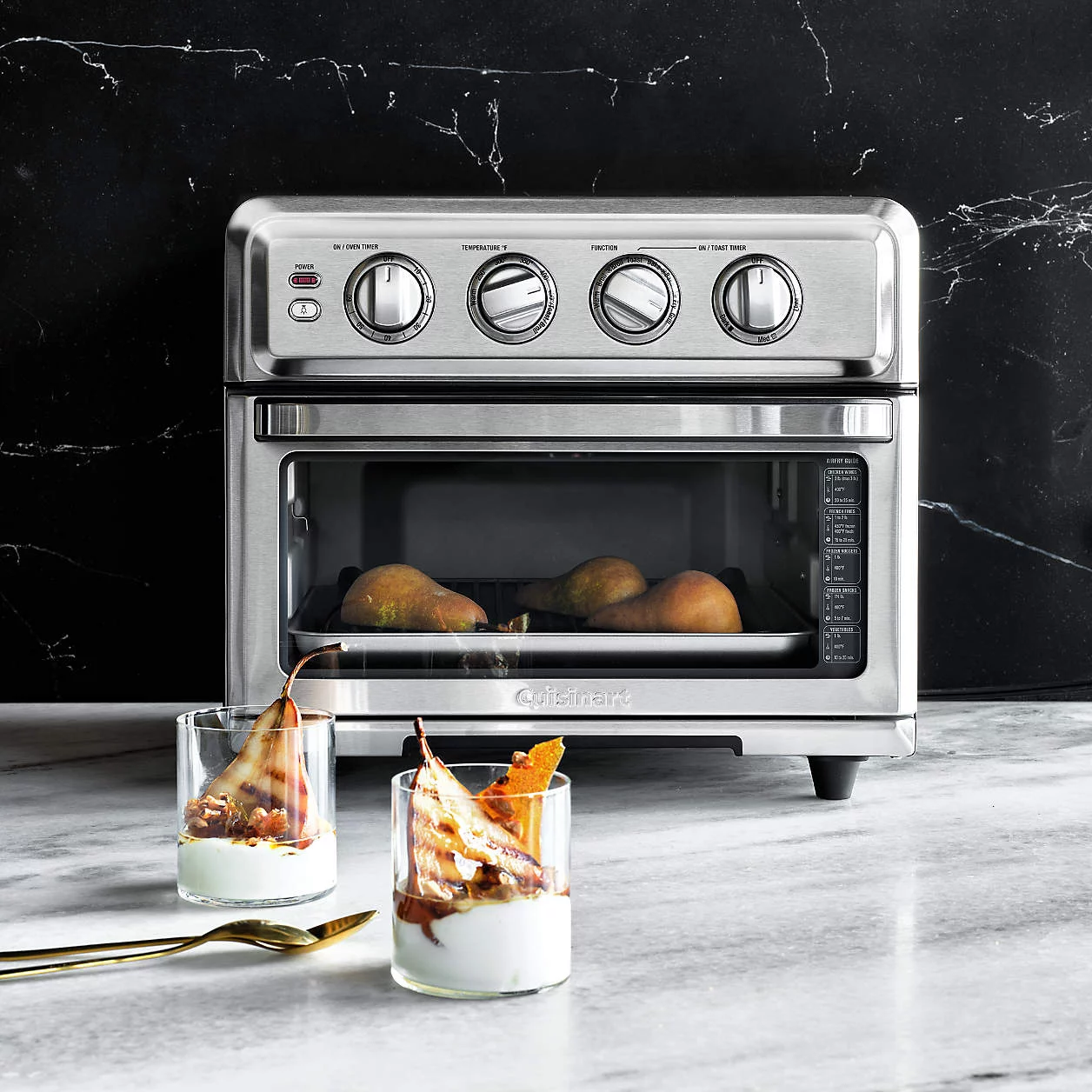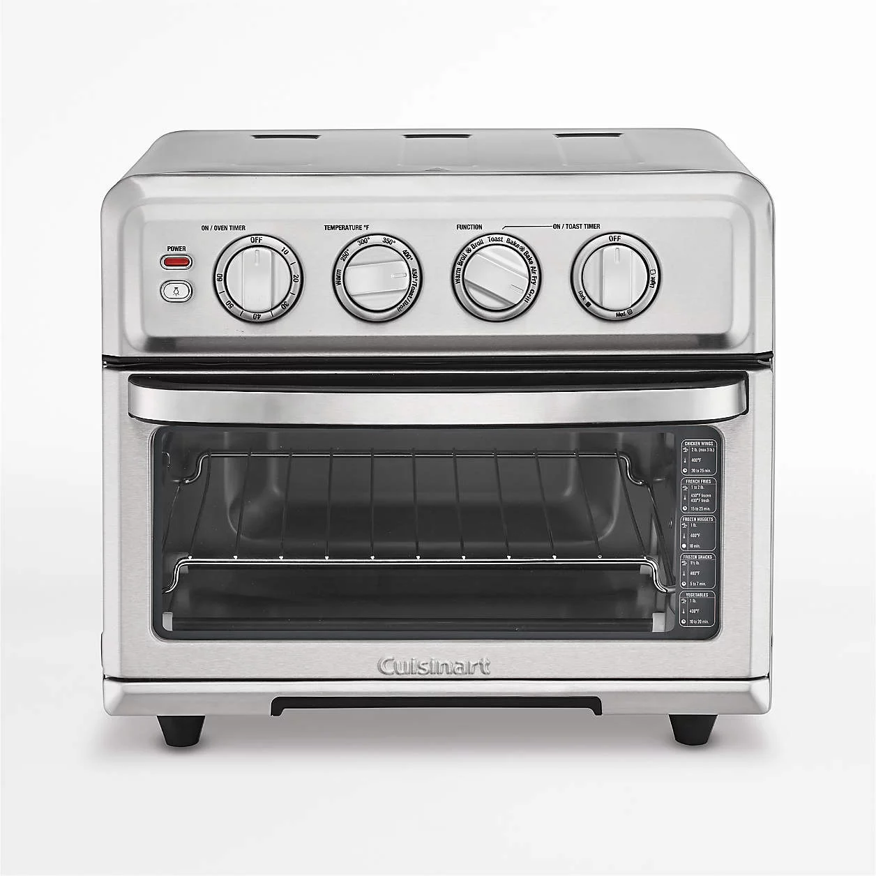 Air fryers are a dream come true, cooking foods to a crispy crunch with little or no oil. Circulating super-heated air to fry food, this fryer offers preset options to perfectly fry wings, French fries, zucchini slices and kale chips. Plus the air fryer incorporates a full-size toaster oven for baking, broiling, toasting and warming, as well as a reversible grill/griddle plate for searing steaks or cooking pancakes and bacon. Sleek in stainless steel, this combination air fryer, toaster oven and grill offers major versatility in one appliance