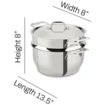 Measuring 10″ in diameter (13.5″ with handles) and 5.5″ high (7″ with lid), this commercial-grade set weighs 6 lb. 12 oz. and is dishwasher safe (hand-washing recommended). Elevate your everyday cooking with All-Clad’s renowned quality—perfect for healthier meals made simple and delicious. Add this essential steamer to your collection today.