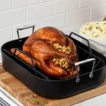 Generous 10.5-quart capacity (17″ x 13″ x 5.5″ overall) accommodates up to a 25-lb. turkey. Oven safe to 500°F and ideal for gas or electric cooktops (not induction-compatible). Dishwasher safe (hand-washing recommended) and backed by a limited lifetime warranty. Elevate your roasting game with professional-grade innovation that’s built to perform beautifully for years—perfect for Thanksgiving, family gatherings, or weekly meal prep.