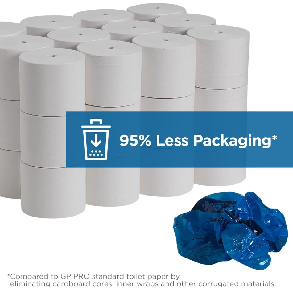 - Coreless format eliminates stub roll waste, maximizes roll usage, and fits seamlessly into modern coreless dispensers