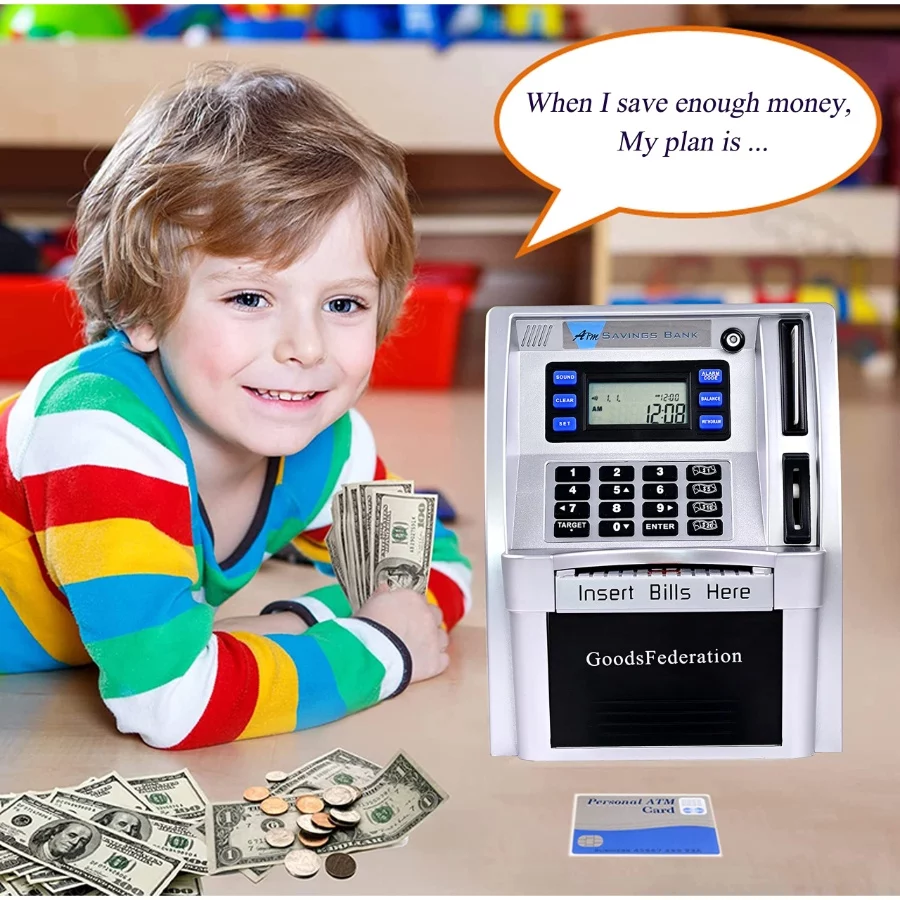 PIN Code Re-Setting–PIN code makes your ‘property’ more secured,easy to change the code to another one.If you forget your password,simply press the RESET button at the back of the ATM piggy bank,the codes will return to 0000.Perfect toy for teaching your boy or girl the value of money in a fun way, making this money bank a great educational toy.