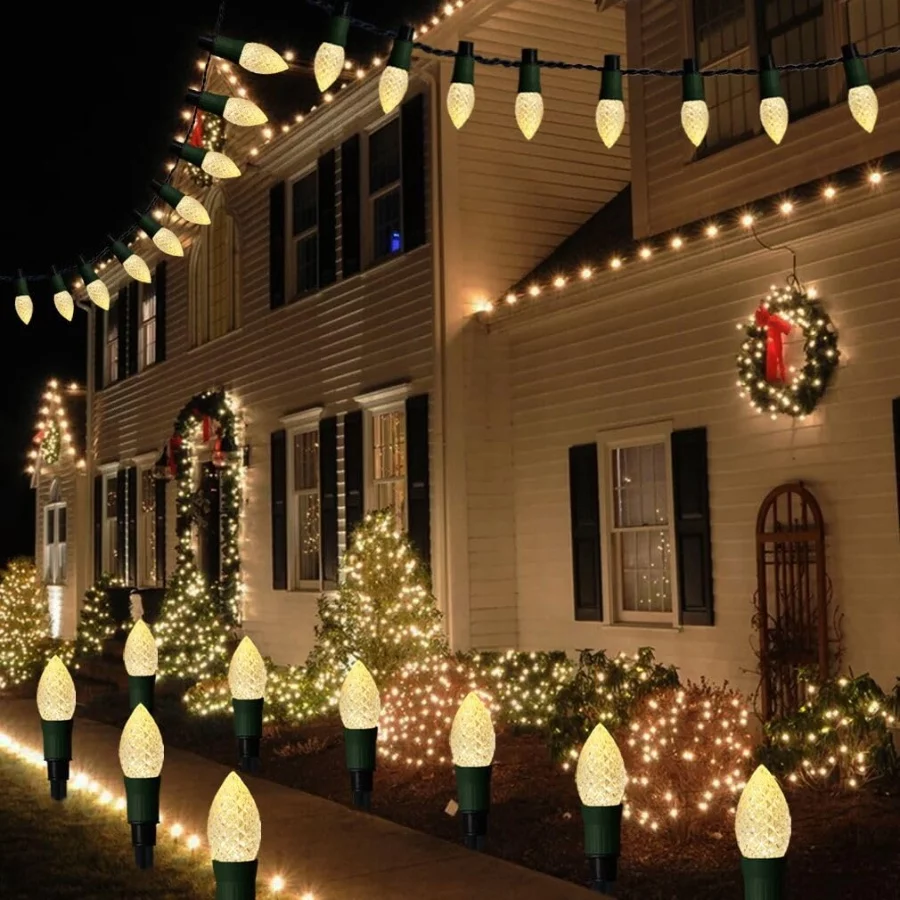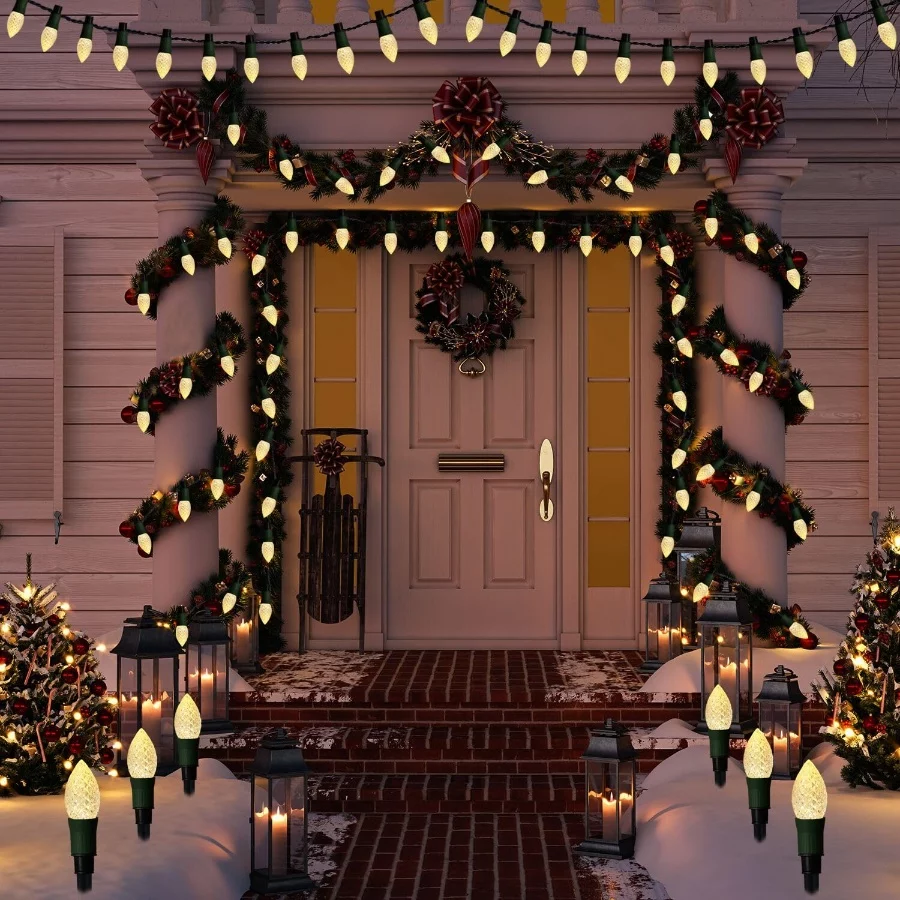 20 LED C9 Christmas Lights Outdoor: 23 feet C9 Christmas pathway lights with 20 C9 strawberry bulbs. 10.3 inches light spacing, 20 sturdy stakes, warm white lighting effect. This Christmas lights for the sidewalk will be great for your pathway, garden, courtyard, outside Christmas decorations. It is also an exquisite gift for friends, families or relatives.