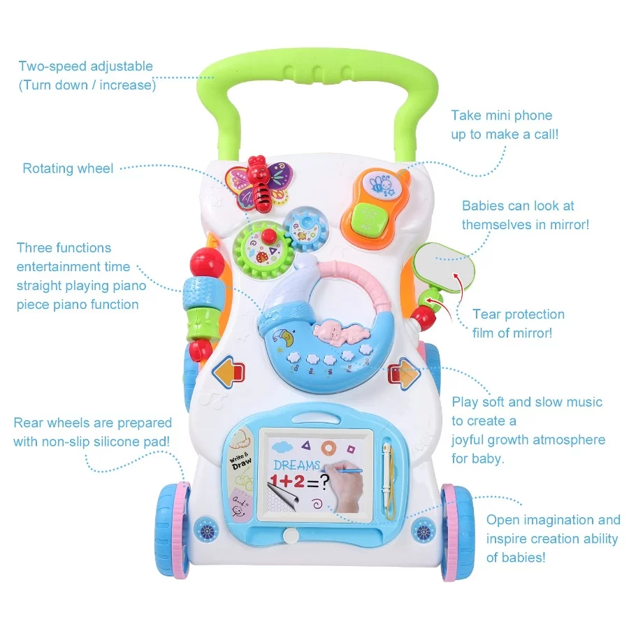 The baby push walkers has easy-grasp handle which helps steady baby’s first steps, plus 7 hands-on activities including light-up piano, rotating wheel, reversible butterfly, mini phone, mirror, slip bead and magnetic drawing board.