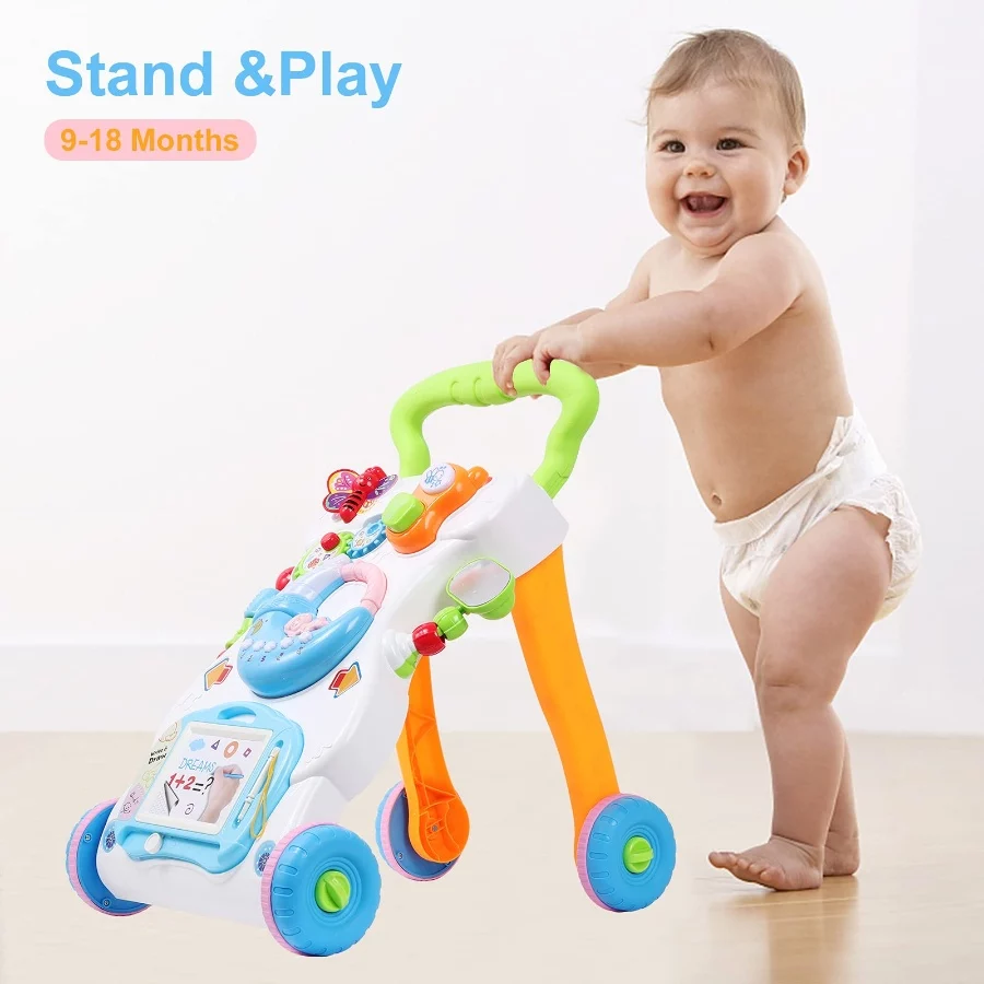 2 in 1 baby learning walking toys designed for baby 6 month up to sit and play, 9 months up for practicing standing and walking. It can help develop kids’ coordination and strength by pushing the walker forward in order to help them learn initial standing and walking.
