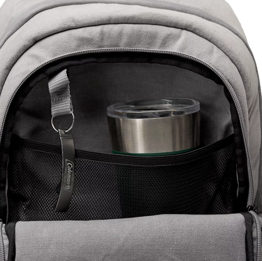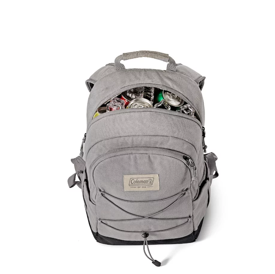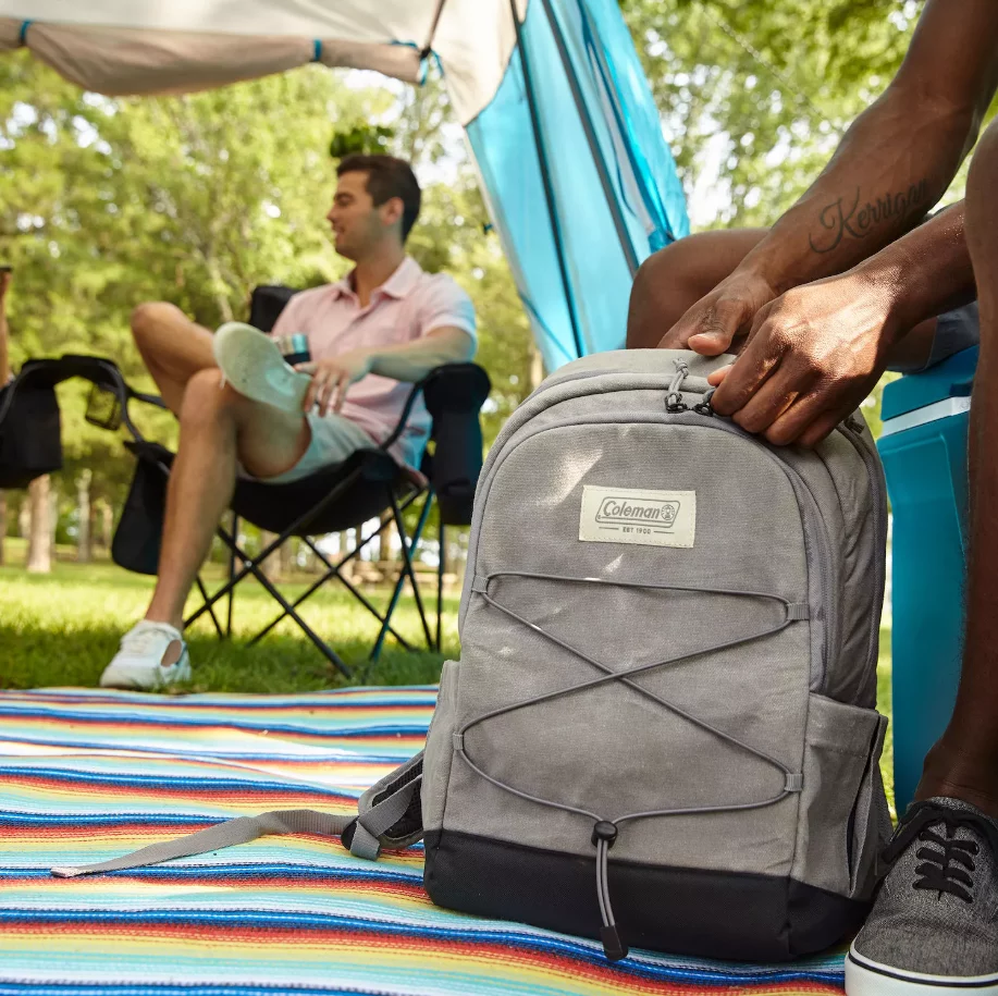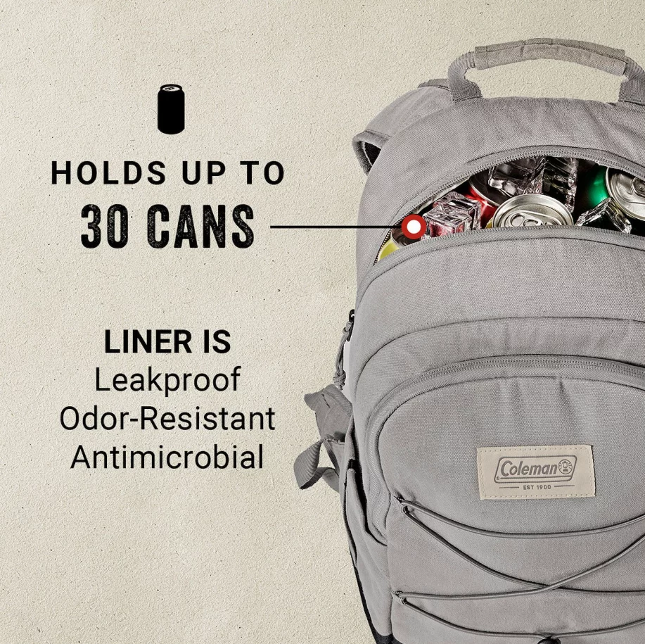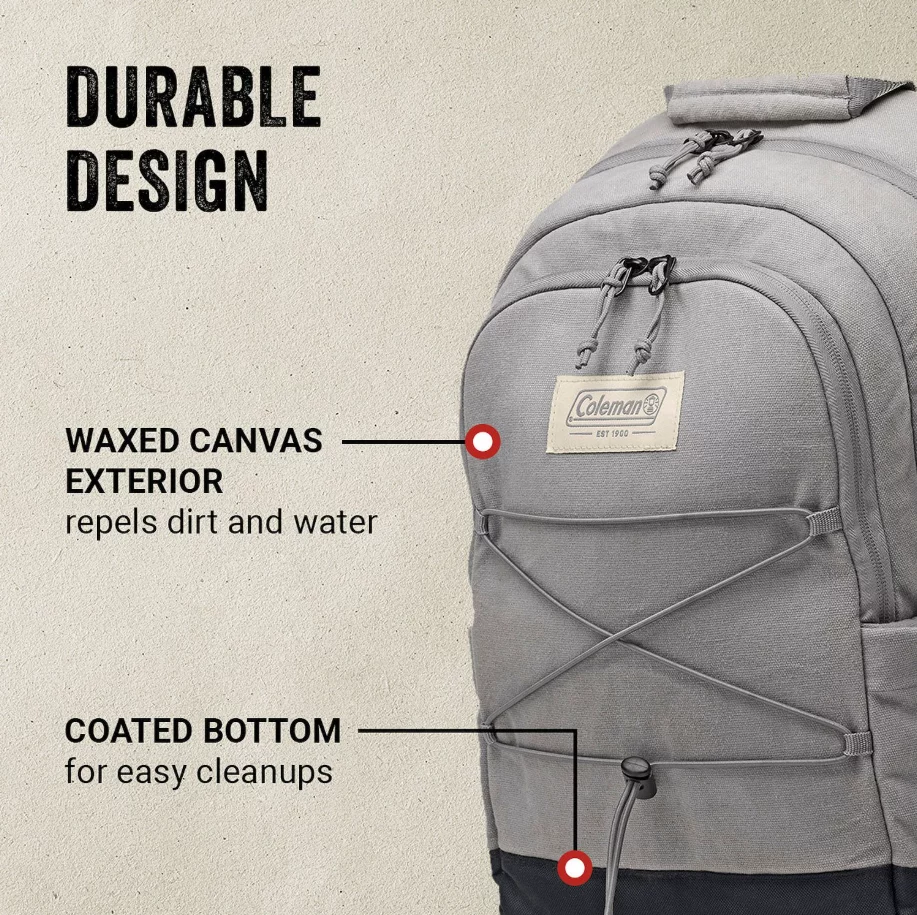 Take your outside adventures to whole new level with the Coleman® Backroads™ 30-Can Soft Cooler Backpack designed to offer a unique look and feel plus the premium Coleman features you just have to have. Made of sturdy waxed canvas that repels dirt and water this cooler is perfect for picnics, tailgates, or festivals. Food and drinks stay cold for up to 24 hours while you toss the frisbee or dig into an extra helping of wings. Padded adjustable shoulder straps, breathable mesh back, plus sternum and waist straps make the cooler comfortable to carry as you weave your way through a crowded festival. Keep your phone, wallet, or keys safe and dry by storing them inside the large front zippered pocket and use the bungee cord to stash a jacket or towel. Side pockets fit a water bottle or sunscreen for convenience. When you’re ready to get the fun started, pop open a cold one using the bottle opener attached inside the front pocket. An antimicrobial leakproof liner helps prevent odor, mildew, and mold so you feel confident making this a go-to cooler backpack for years.