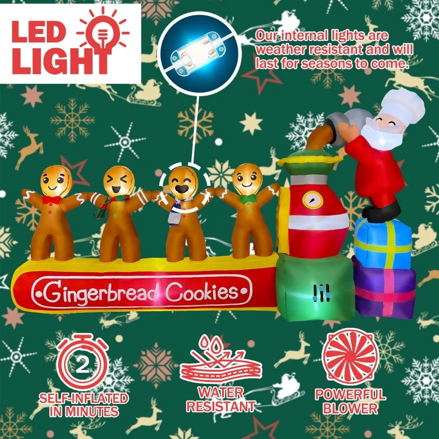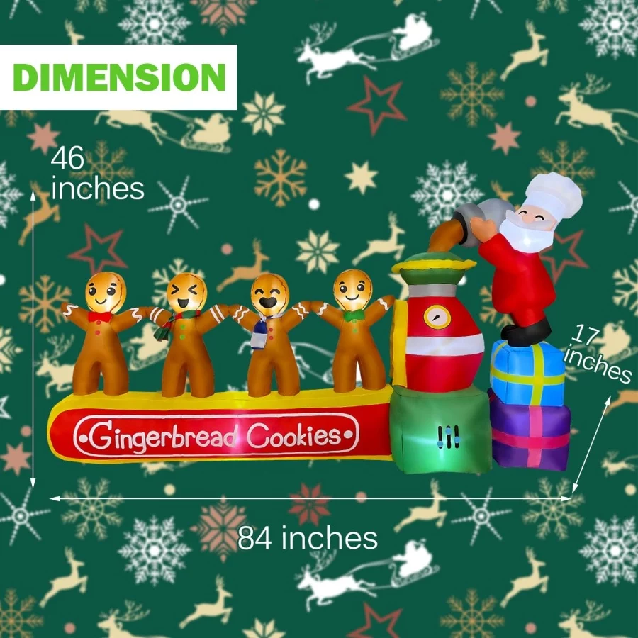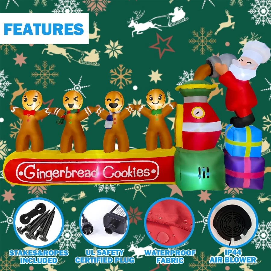 Our Christmas inflatable 7FT Gingerbread Cookies Machine Decoration creates a warm and happy Christmas atmosphere for your front yard.Being the perfect centerpiece for your Christmas festivities and bringing holiday cheer with sweet. Made from durable, weather-resistant materials, it includes built-in LED lights for a vibrant nighttime display. Perfect for adding a touch of surprise to your holiday decor, delighting neighbors and guests alike.