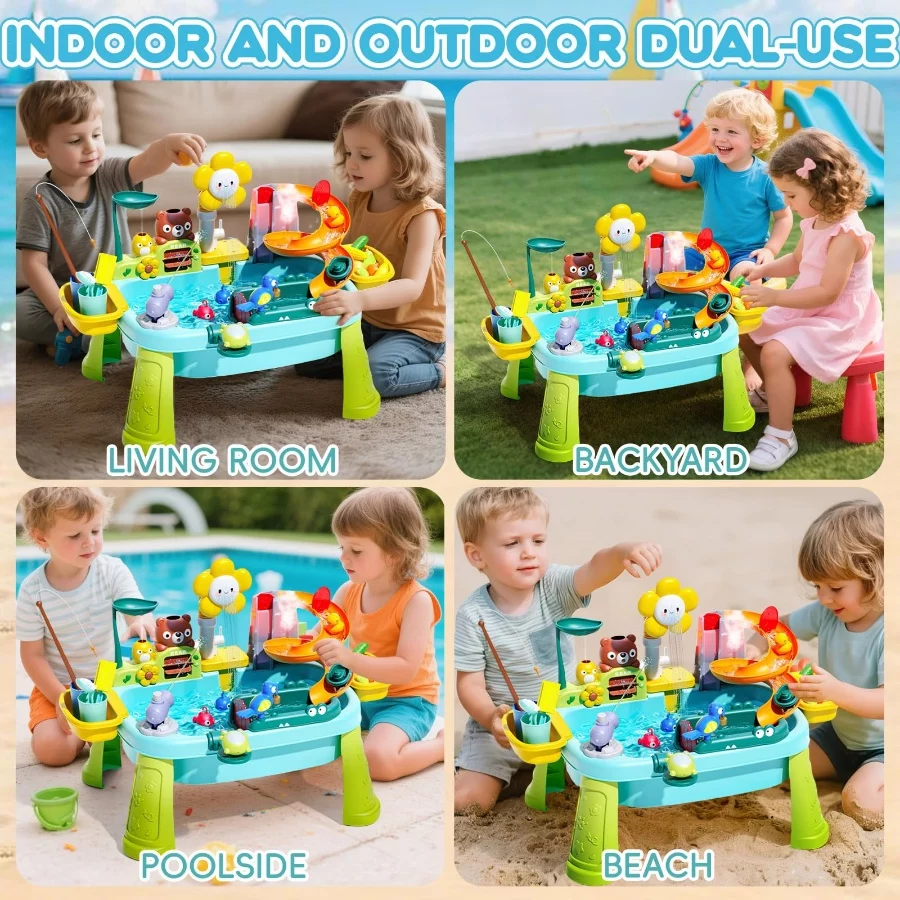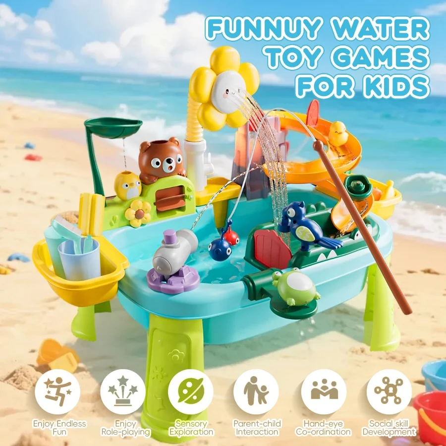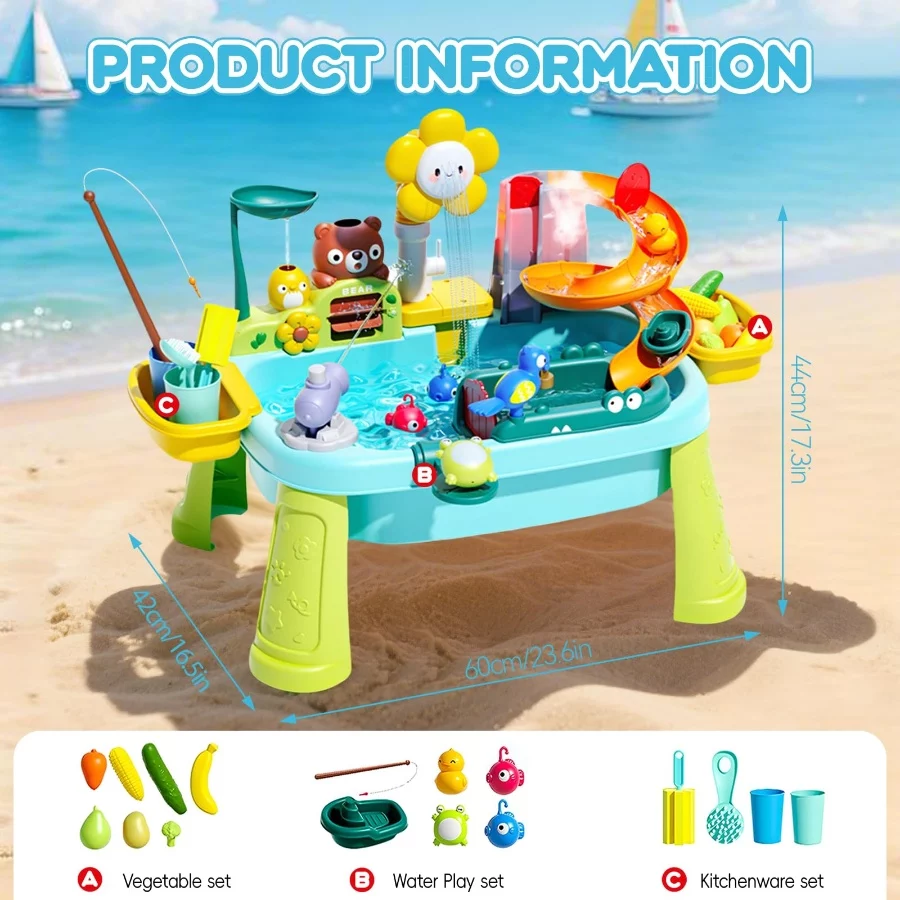 Multi-functional Play Experience: This 21.26”L x 11.42”W x 20.87”H mini 4-in-1 toy water table combines kitchen role play, water table games and fishing games! Kids can experience the fun of cleaning vegetables, washing dishes and fishing. The water table is also designed with a cute cloud faucet and slide, allowing kids to explore the flow of water during play, stimulating their creativity and hands-on skills.