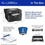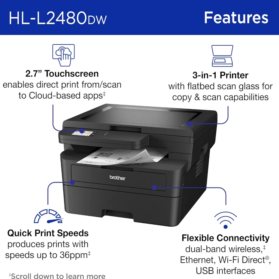 Power your small office or work-from-home setup with the Brother HL-L2480DW Wireless Compact Monochrome Multi-Function Laser Printer—a space-saving 3-in-1 device that combines fast, professional black-and-white printing, flatbed scanning, and copying in one reliable, efficient package. Engineered for high-volume productivity and consistent quality, this compact laser all-in-one delivers crisp documents with minimal maintenance and outstanding value.