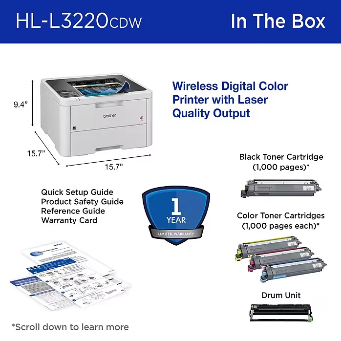 Backed by Brother’s 1-year limited warranty and free lifetime online, call, or live chat support, the HL-L3220CDW combines dependable laser performance, wireless convenience, and eco-conscious design. Whether printing reports, photos, labels, or everyday documents, enjoy crisp, professional results that enhance your work-from-home productivity without breaking the budget. Add this capable Brother laser printer to your setup today.