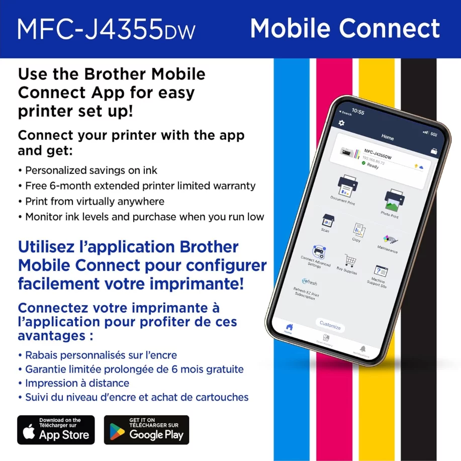 - Brother Mobile Connect app enables remote printing, scanning, device management, and supply monitoring