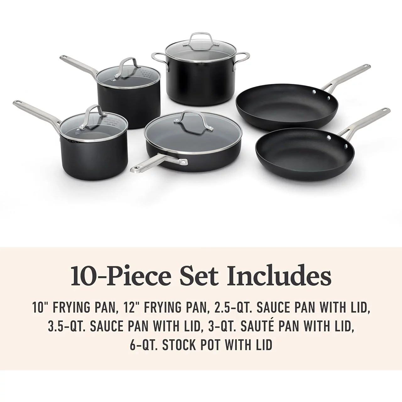 - 10-Piece Set Includes: 10-inch frying pan, 12-inch frying pan, 2.5-quart sauce pan with lid, 3.5-quart sauce pan with lid, 3-quart saut pan with lid, 6-quart stock pot with lid.