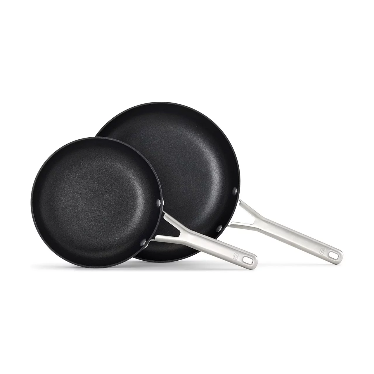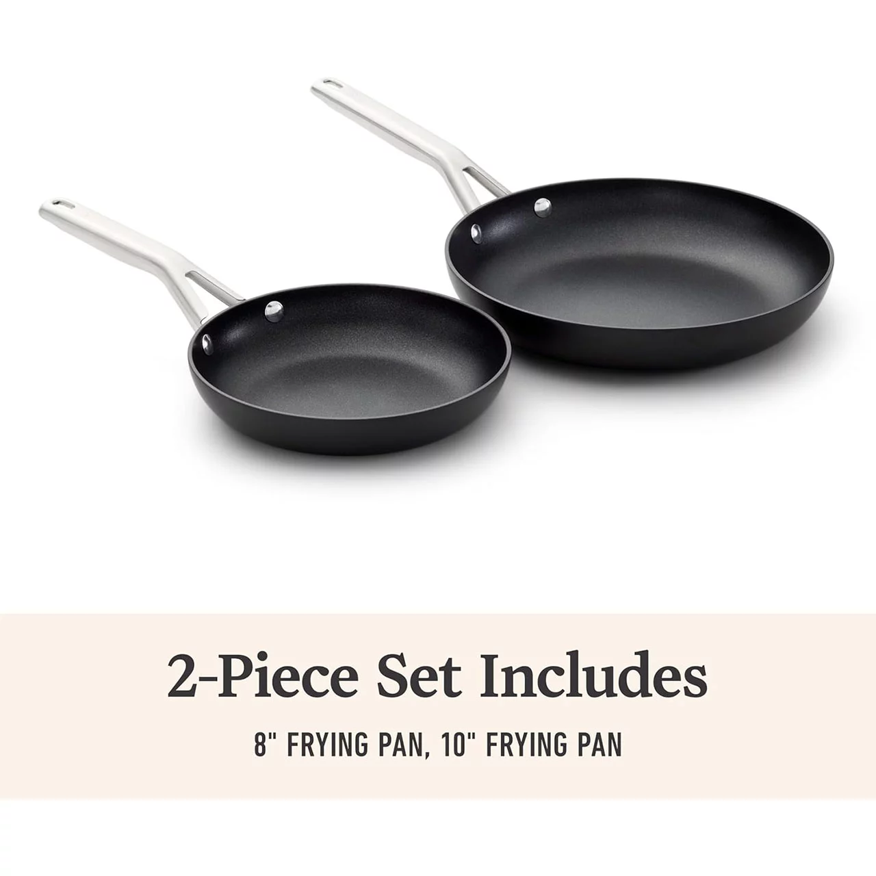 - 2-Piece Frying Pan Set Includes: 8-inch frying pan, 10-inch frying pan.