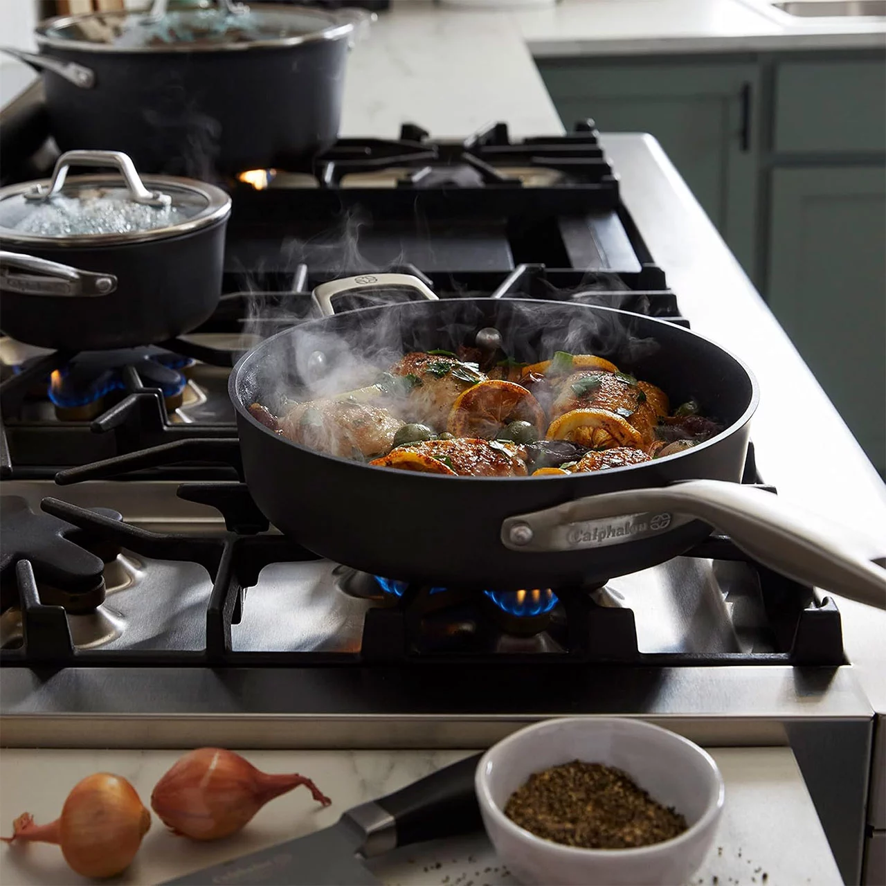 Quite a few years back my wife and I purchased a set of the Calphalon Space-Saving cookware and we haven’t looked back. I had to replace our 12″ fry pan as that is our primarily used pan. It was showing a lot of wear and wasn’t as non-stick as it used to be. I accidentally ordered this sauté’ pan and will definitely keep it. It is wonderful and I have inspected some of our other pans and will replace a couple of them as well. The space-saving feature is fantastic and will definitely aid you in keeping pans in a compact area providing more room for other kitchen items. I love having this sauté’ pan as it has the same volume as our dutch oven. It is very easy to cook our meals with and cleanup is a breeze. The depth compared to a 12″ fry pan is a great option to have. If you are in need of a sauté’ pan then this should be on the top of your list to consider. It is versatile and will provide you years of cooking enjoyment.