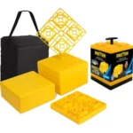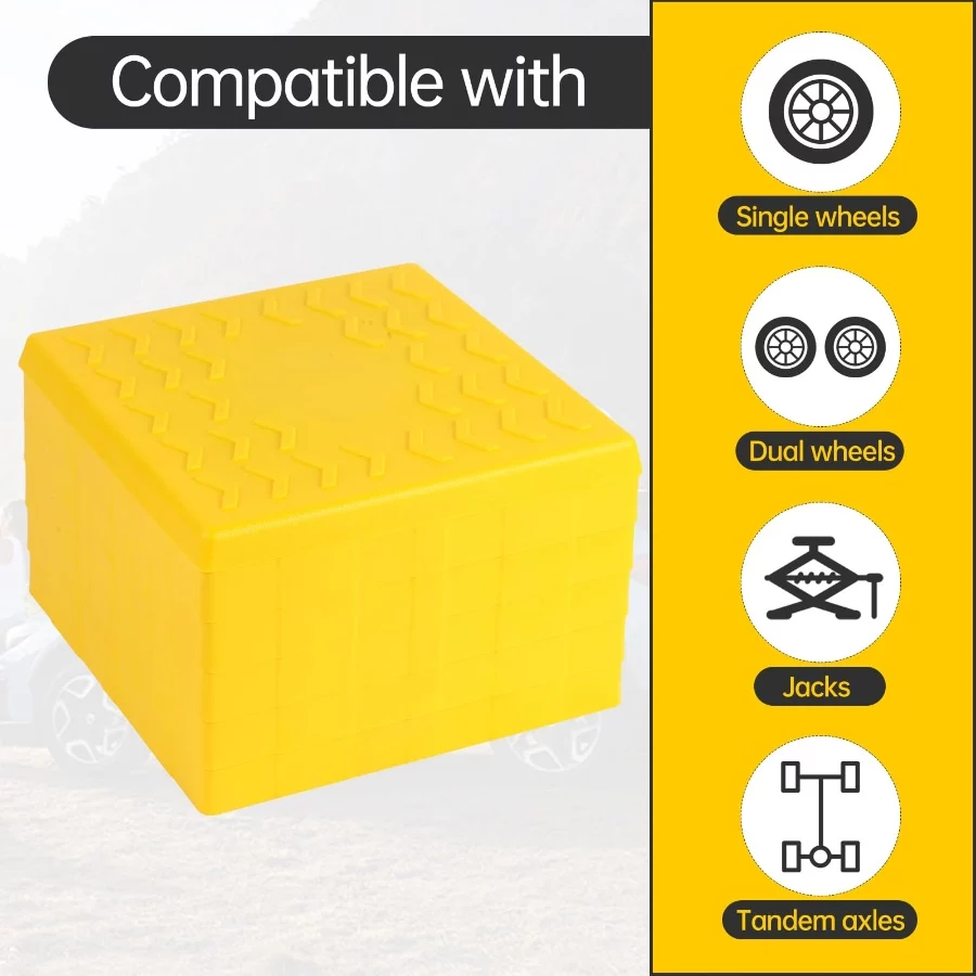 Durable and Robust Construction: Made from high-density, reinforced material, camper leveling blocks provide reliable support for RV wheels. Each yellow block measures 8.54″ x 8.54″ x 1.47″. They prevent leveler sliding when backing camper tires onto them and are designed for years of rugged use. The solid bottom structure prevents sinking into soft ground.