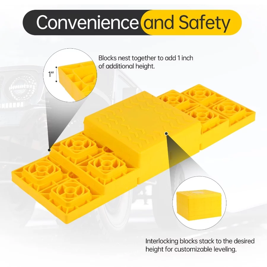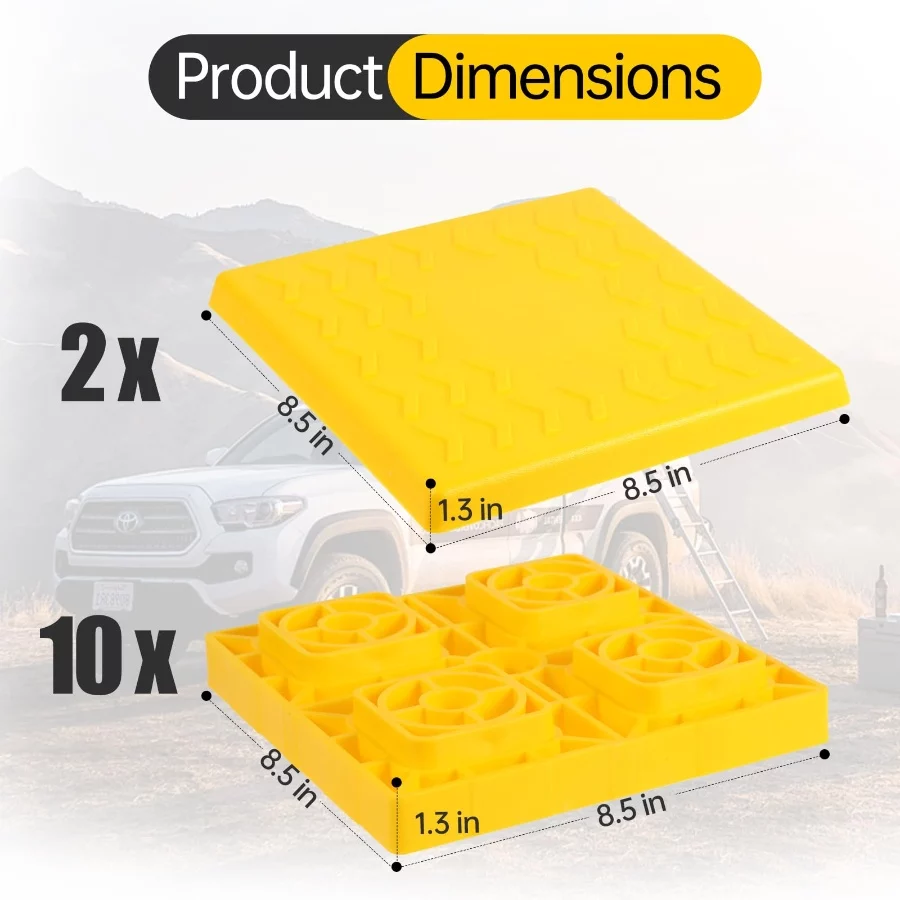 Adjustable Leveling Height : This RV leveling block set includes 12 yellow blocks (10 interlocking blocks and 2 top blocks) with a carrying bag. Stack the blocks in a pyramid shape to achieve the desired height for leveling. Each set comes in a zippered storage bag with a handle for easy transport.