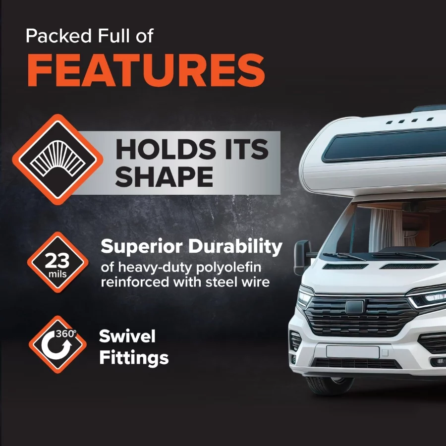 Built Flexible & Tough: Constructed with 23 mils of durable polyolefin and reinforced with steel wire, the RhinoFLEX RV black water hose can bend & maintain its shape for reliable, long-lasting use.