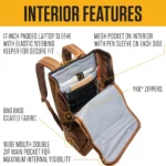 - 17″ Padded Laptop Protection: Dedicated interior sleeve with elastic webbing keeper secures laptops up to 17 inches; padded for impact resistance and quick access via the wide-mouth main opening.
