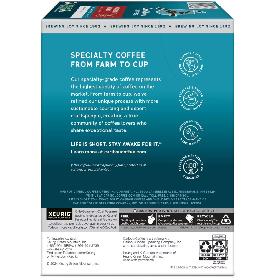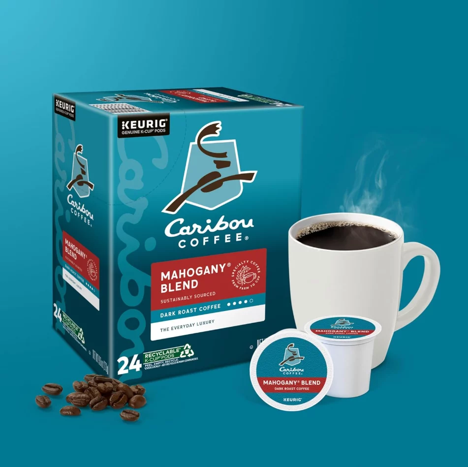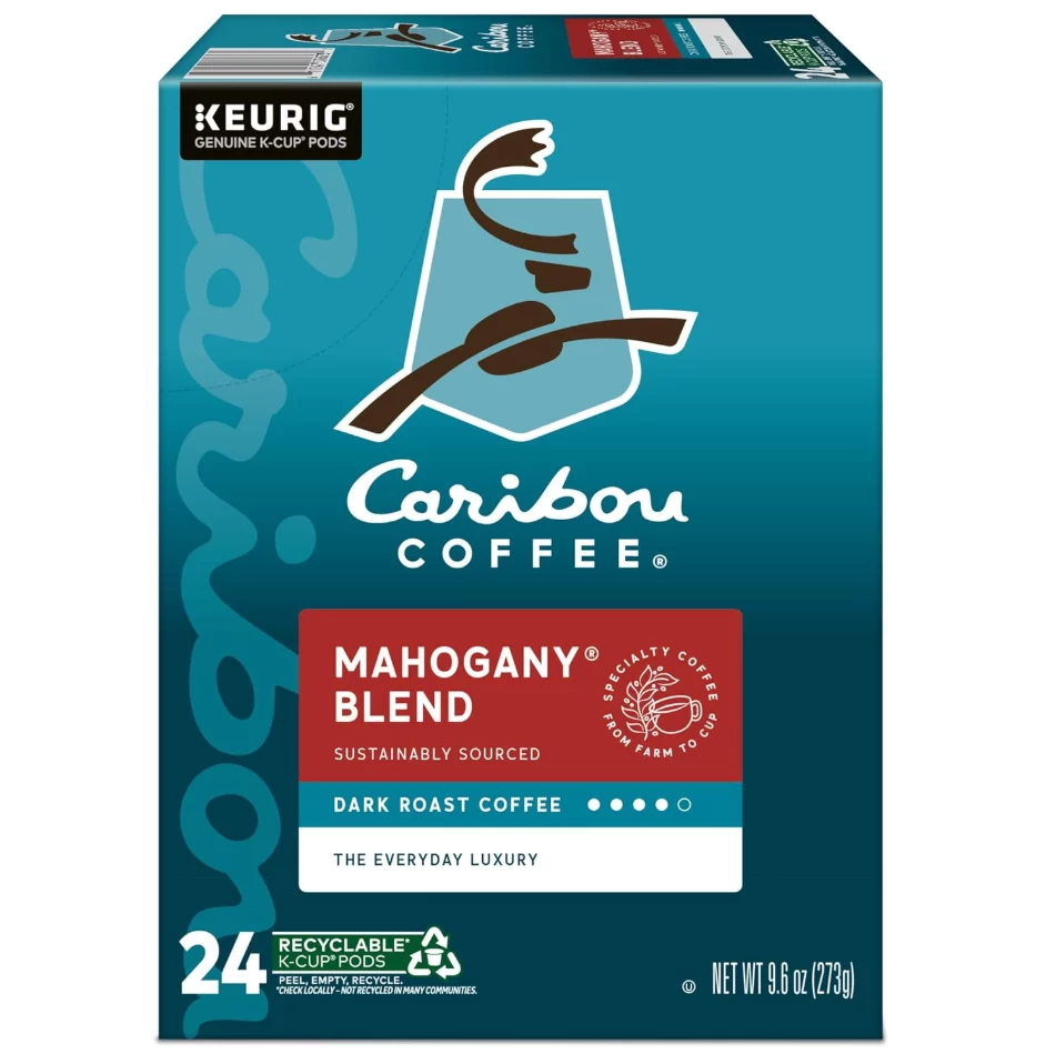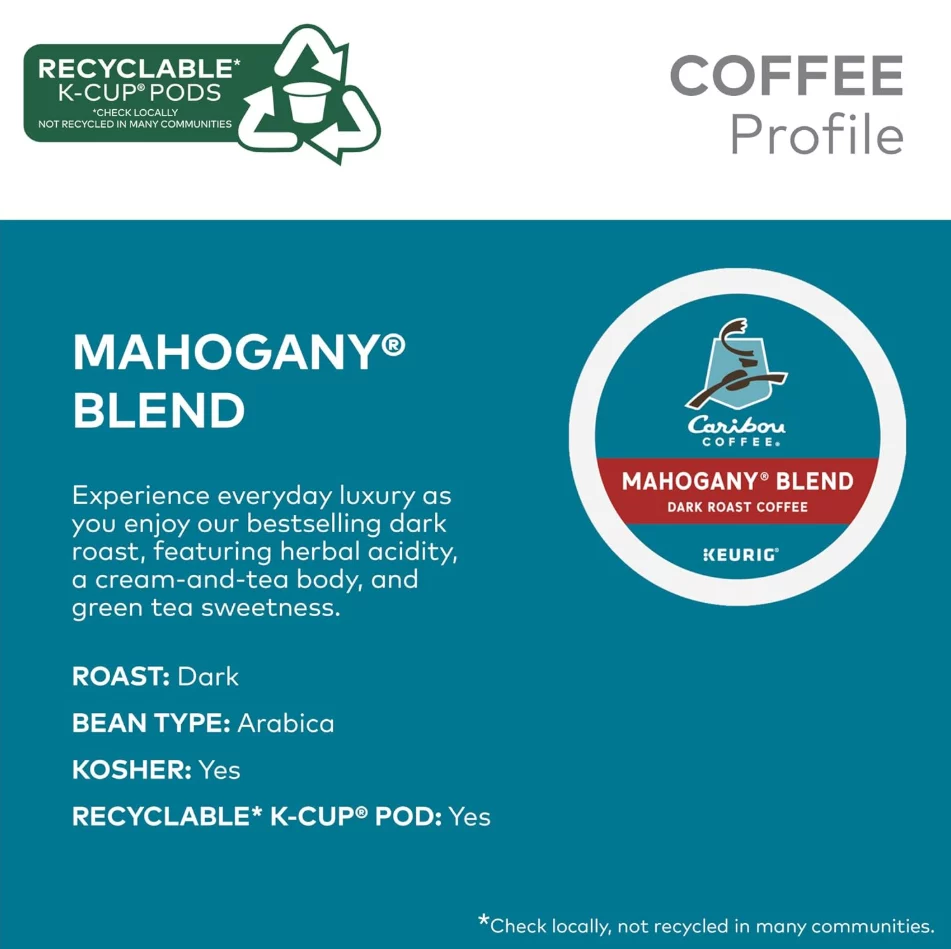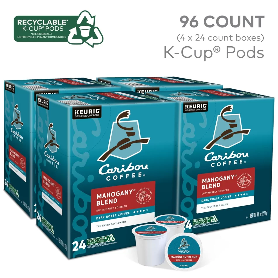 Caribou Coffee Mahogany Blend Keurig K-Cup Pods, Dark Roast, Bold with Spice, Woodsy & Floral Vanilla Notes, 96 Count/Carton – 100% Arabica, Kosher, Rich El Salvador, Sumatra & Guatemala Blend