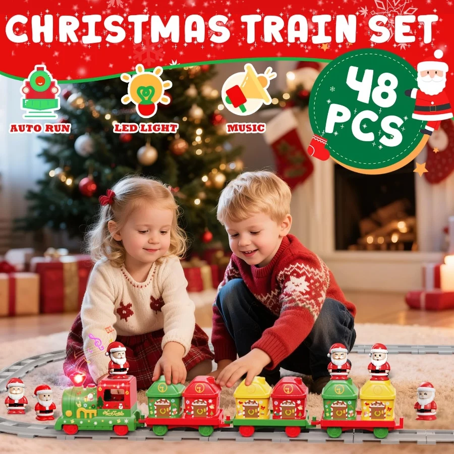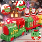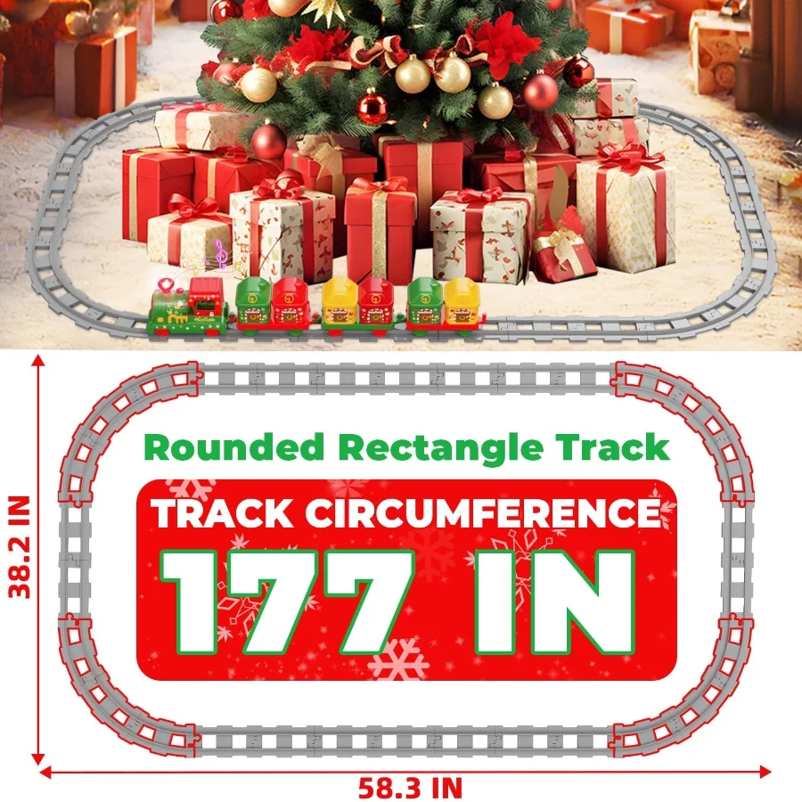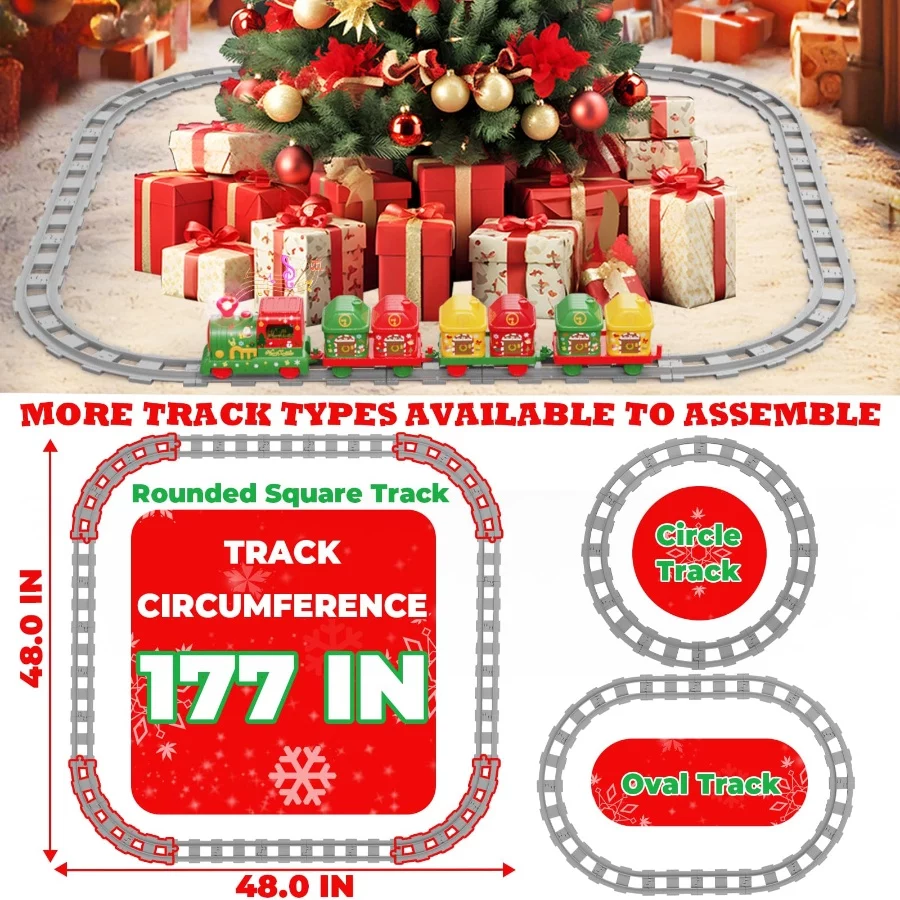 CHRISTMAS TRAIN SETS FOR AROUND THE TREE: This Christmas train set features easy-to-connect tracks that form a giant 177-inch loop for immersive play. Simply install 3 AA batteries (not included) to power the automatic engine that runs smoothly on both tracks and flat surfaces. With Christmas music and lights, it offers multi-sensory play that engages both boys and girls—the perfect first step into the exciting world of trains.