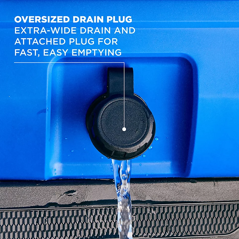 - Attached oversized drain plug drains fast without getting lost