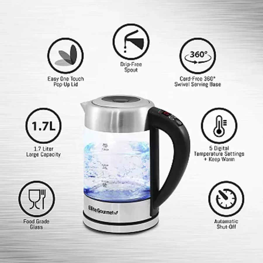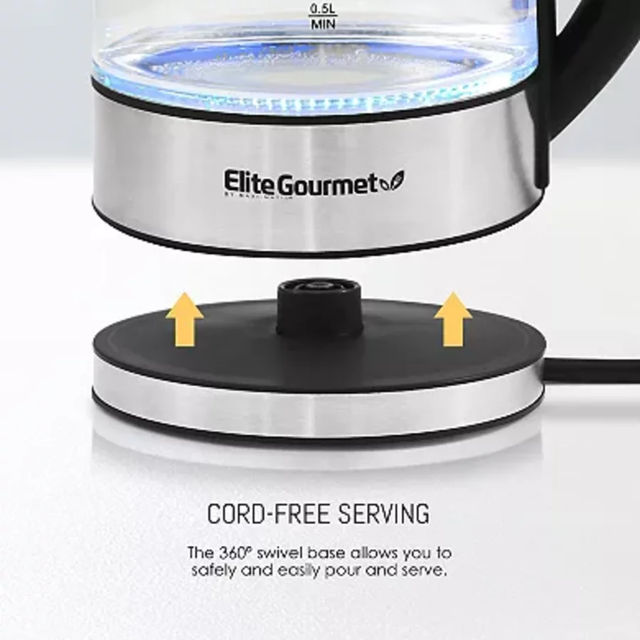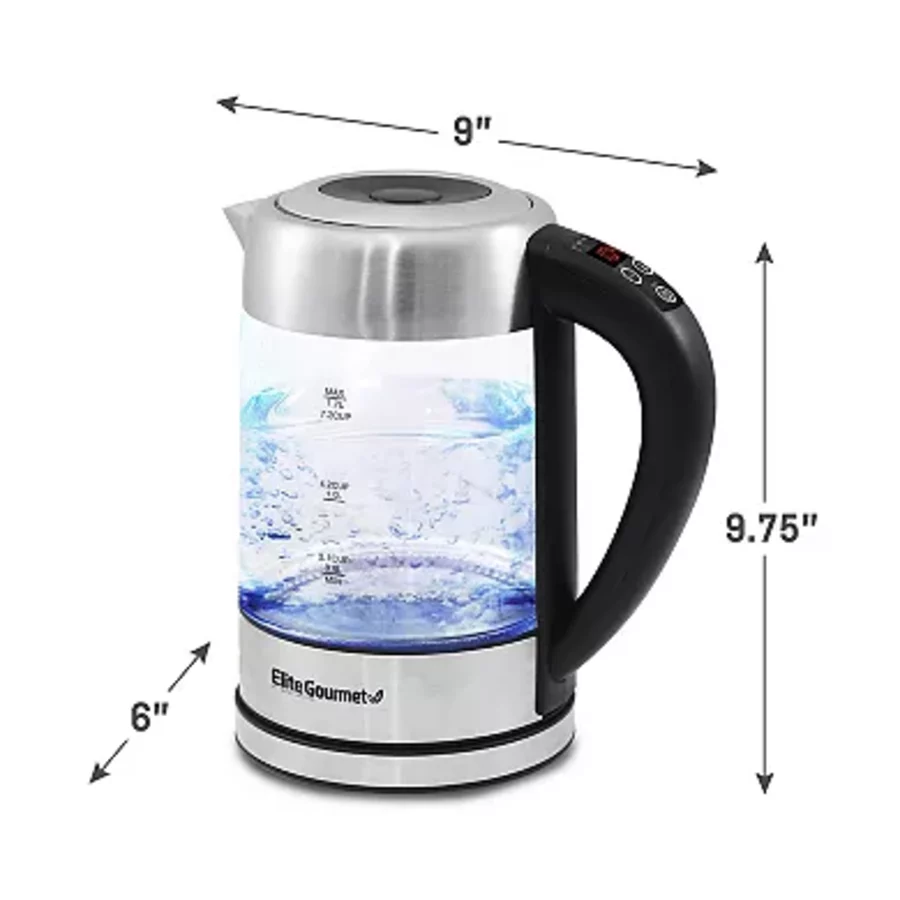 This Elite Gourmet electric kettle is everything I wanted and more. It boils water incredibly fast—perfect for my morning coffee or late-night ramen. The 1.7L capacity is great for multiple cups, and the clear window with level markings makes it easy to measure the exact amount I need. The one-touch lever and auto shut-off features are lifesavers—no more worrying about forgetting it on! The 360° swivel base makes pouring a breeze, especially with the ergonomic handle and wide spout. I also love how sleek it looks on my countertop. It fits right in with my modern kitchen, and the glossy finish gives it a premium feel. Cleanup is fast and hassle-free, and the cord wrap keeps my space tidy. Whether you’re using it in an apartment, office, or home kitchen, this kettle is dependable, safe, and built to last. Elite Gourmet knocked it out of the park. Highly recommend!