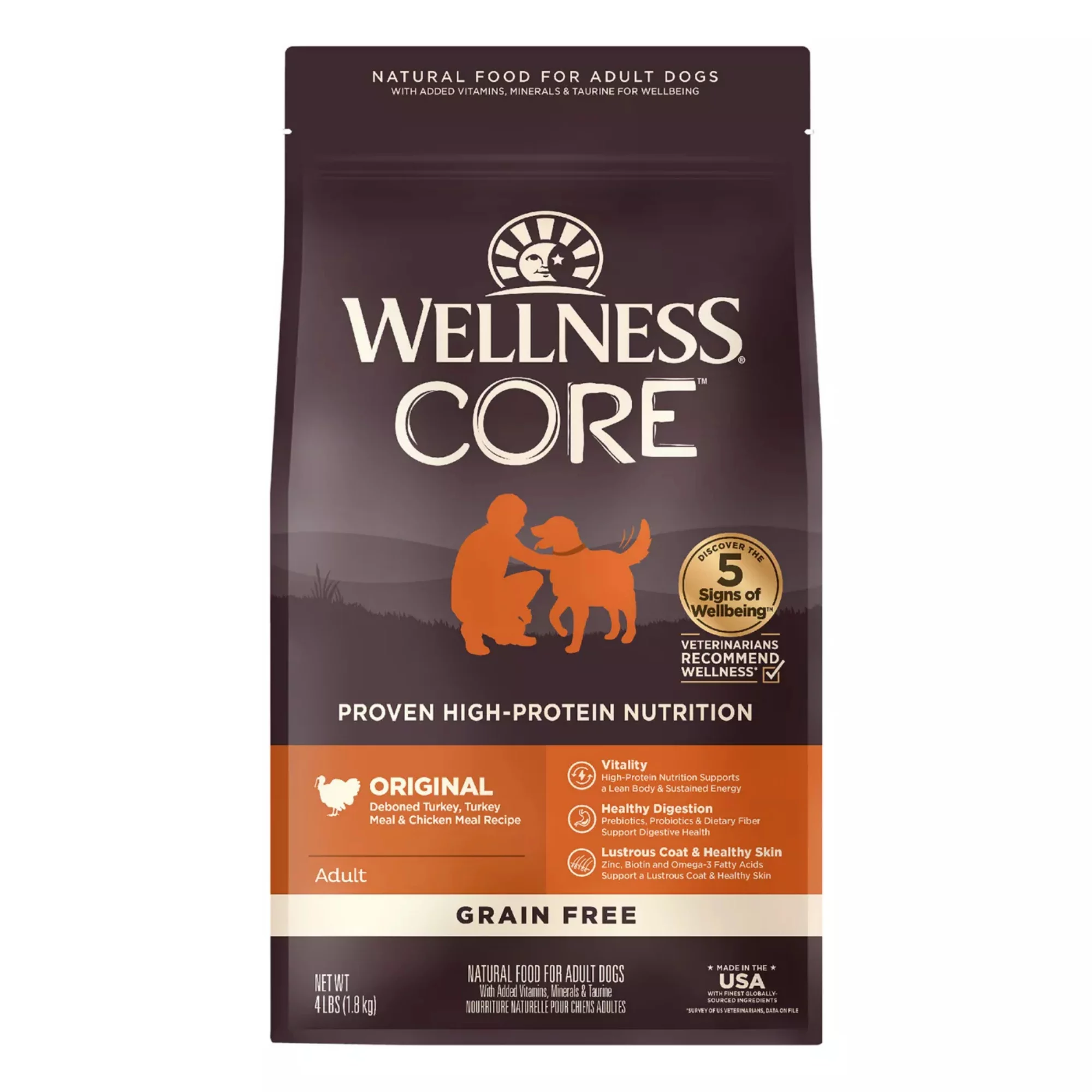 Give your dog the protein-rich nutrition they need to thrive with Wellness CORE Original Turkey & Chicken Dry Dog Food. This grain-free, high-protein recipe is crafted with premium turkey, chicken, and salmon oil, plus nutrient-dense fruits and vegetables for complete and balanced daily nutrition.
