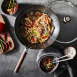 This fast-heating, 12-inch Chinese Wok is ideal for everything from beef and broccoli to deep-fried chicken cutlets. Featuring thin, high curved sides and a thick, flat bottom, it’s the ideal cookware for high-heat cooking. The tempered glass lid lets you monitor your food as it cooks while the stay-cool, walnut handles are designed for maximum maneuverability. And the stainless-steel hanging loop makes it easy to store your wok when you’re through cooking.