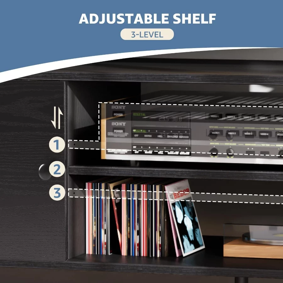 Smart Storage & Cable Management – Stay organized with 2 soft-close cabinets and a 3-level adjustable center shelf. The built-in cable management holes keep wires out of sight, helping to maintain a tidy and clutter-free entertainment area.