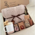 COMPLETE GIFT SET: Thoughtfully curated care package featuring a soft knit blanket, ceramic two-tone mug, bath salts, scented candle, and inspirational message card,With its earth tone color scheme, it is gender neutral.