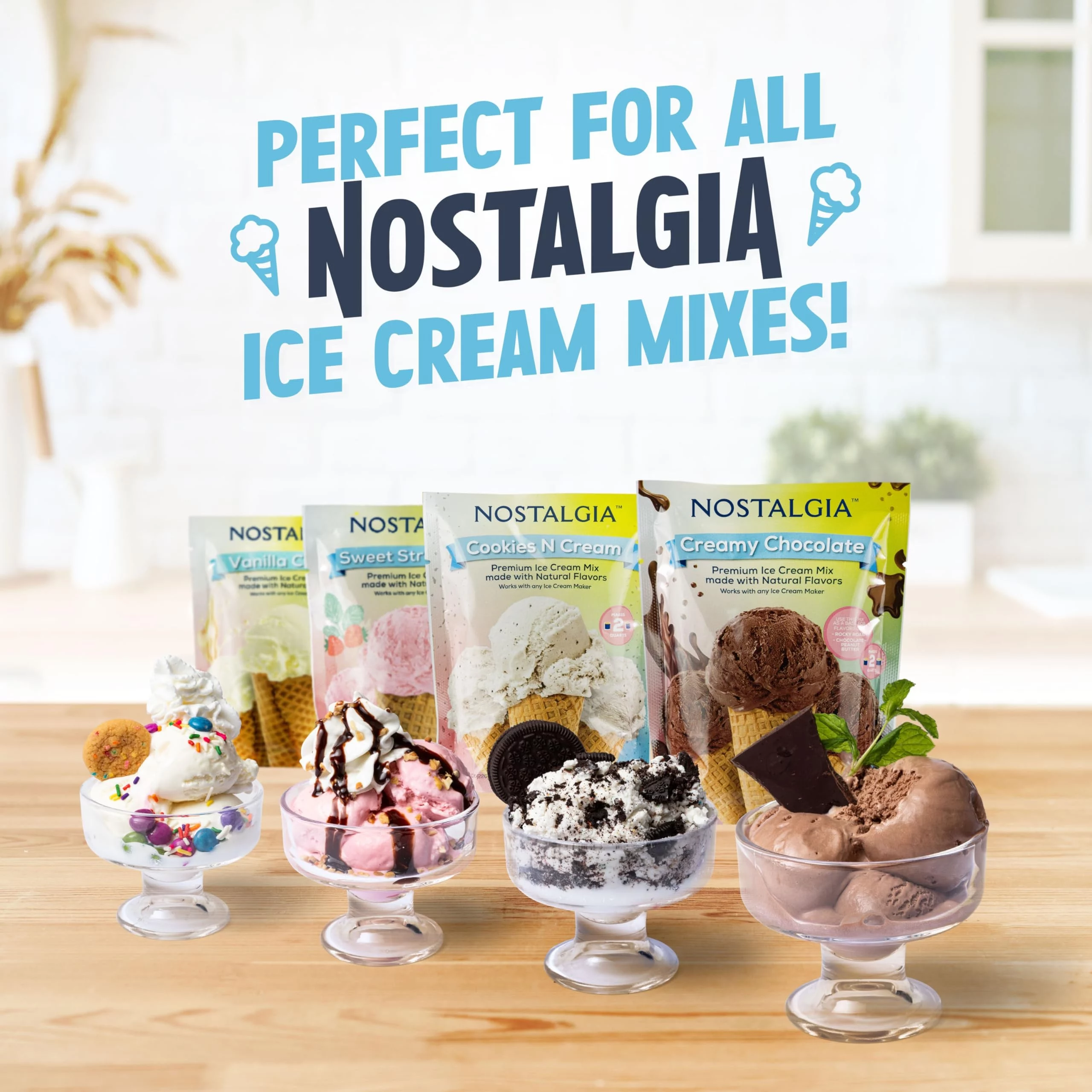 NOSTALGIA ICE CREAM KITS: Our ice cream machines for home pair perfectly with all Nostalgia ice cream kits. Try the vanilla crème, chocolate, and strawberry ice cream mix or the premium starter kit, which is excellent for a party or snack time.