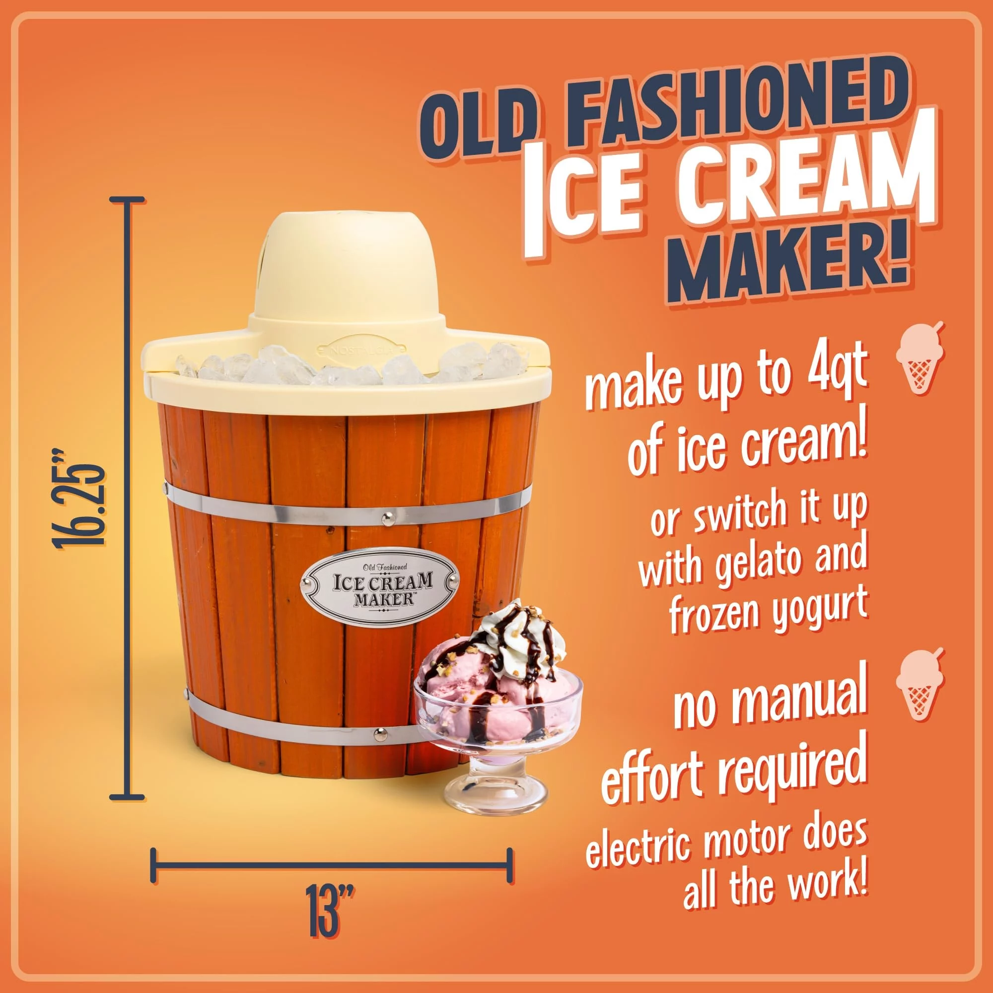 Electric Ice Cream Maker – Old Fashioned Soft Serve Frozen Yogurt – Vintage Wooden Style – Light Wood – 4 Quart