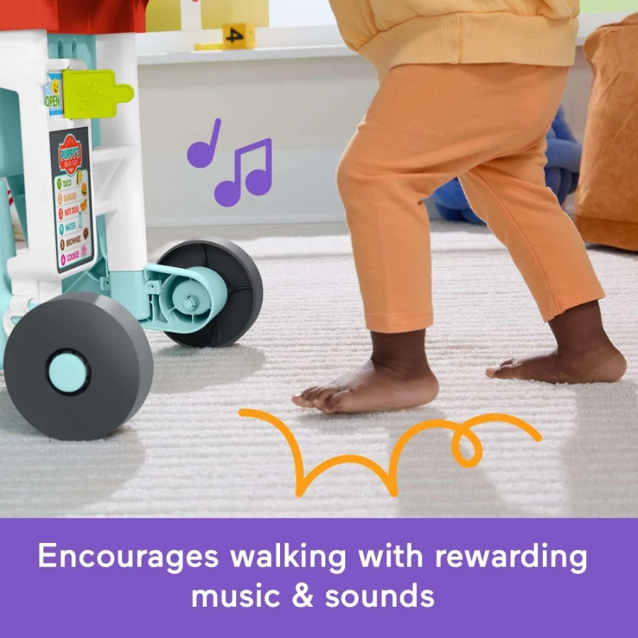 Snack cart-themed push walker and educational activity toy with 4 ways to play as your baby grows from sitting to walking to pretending