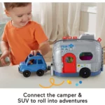 Kids can connect the RV to the car and roll both along to “drive” from one camp site to the next