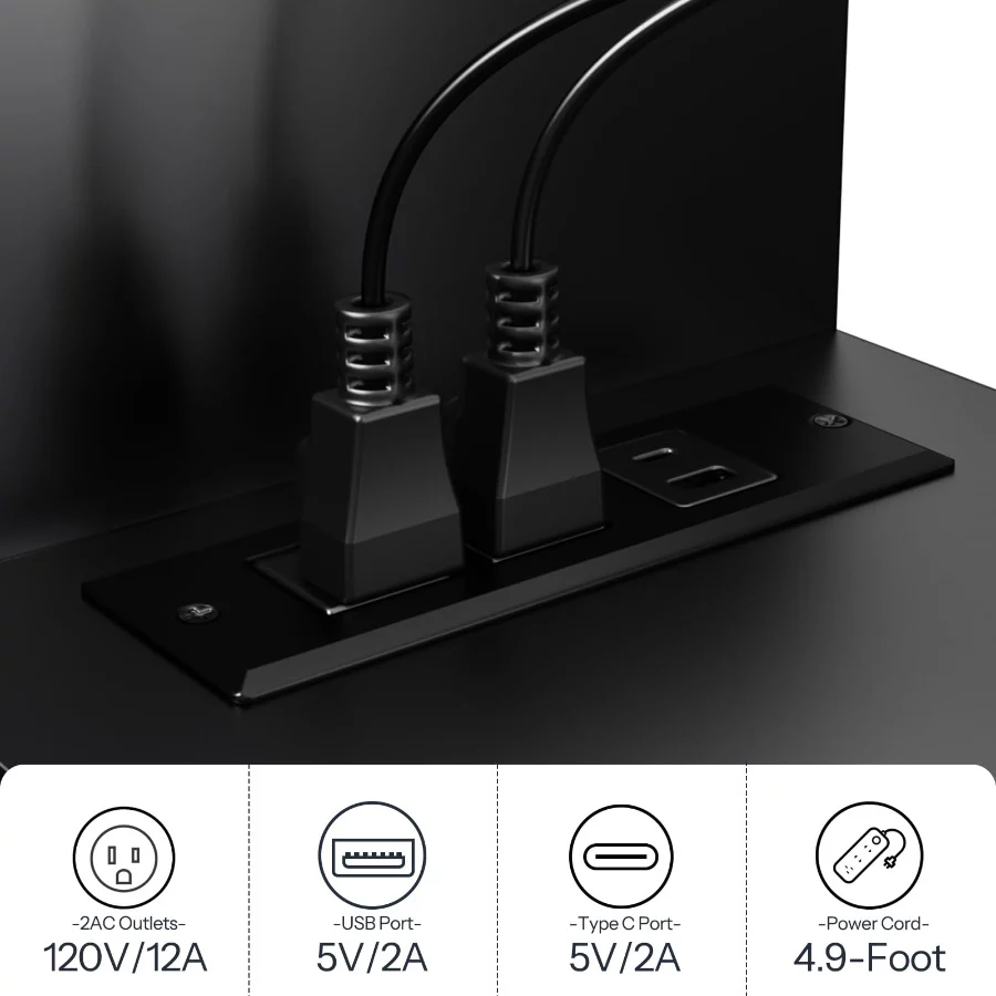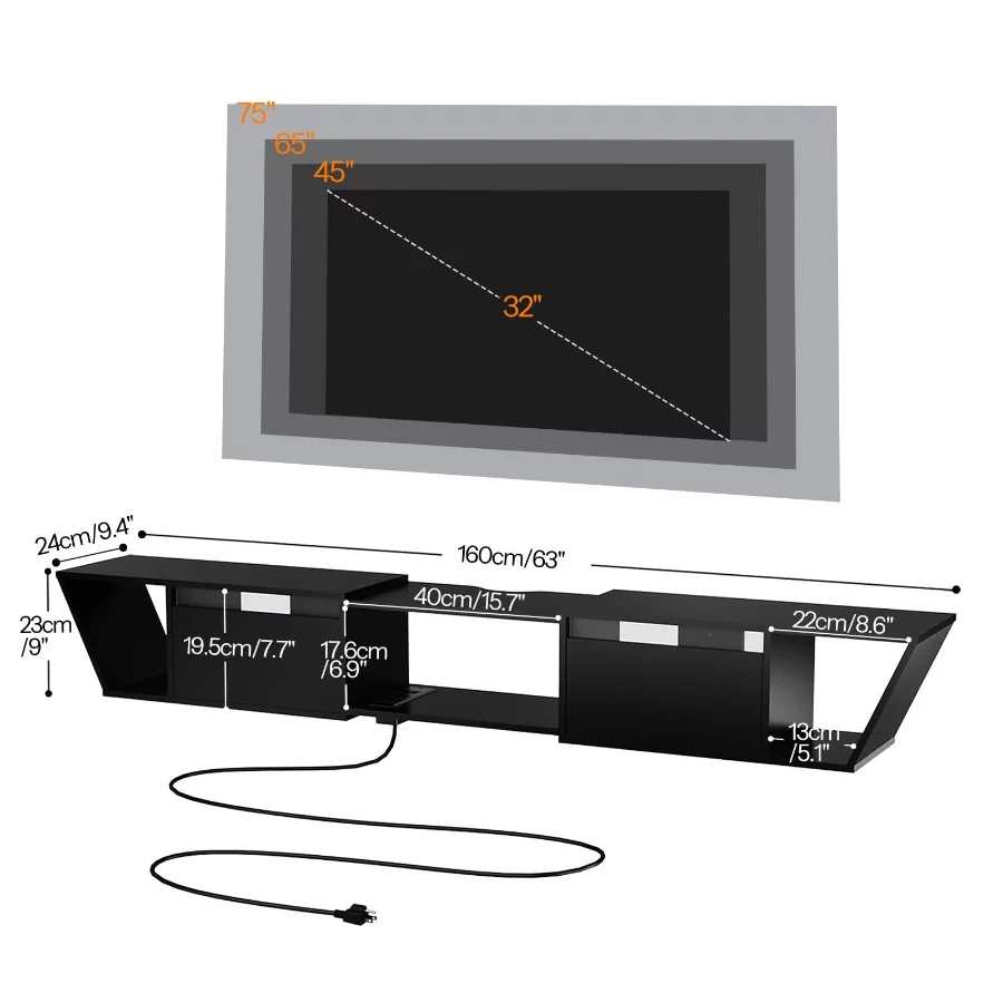 All-in-One Charging & Cable Management: The floating TV stand integrates 2 AC, 1 USB & 1 Type-C port, meeting the charging needs of your TV, WiFi router, phone, and gadget. The unique hollow design hides cables, keeping your living space tidy.