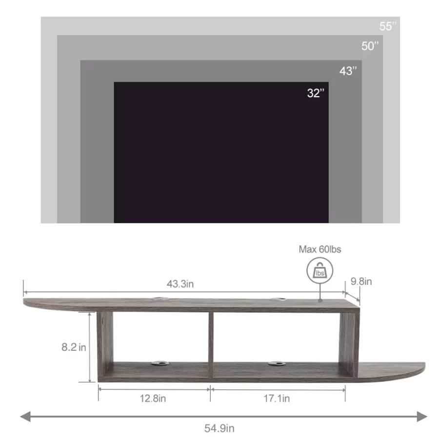 Space Saving & Ample Storage: The floating tv stand frees up valuable floor space. In addition, It features 2 tiers storage shelves are perfect for media appliances that have a place to store in categories to keep the home clean and tidy. The floating entertainment center can not only store DVD player, WIFI router but also Xbox PS4 game console, TV decoder, remote control.