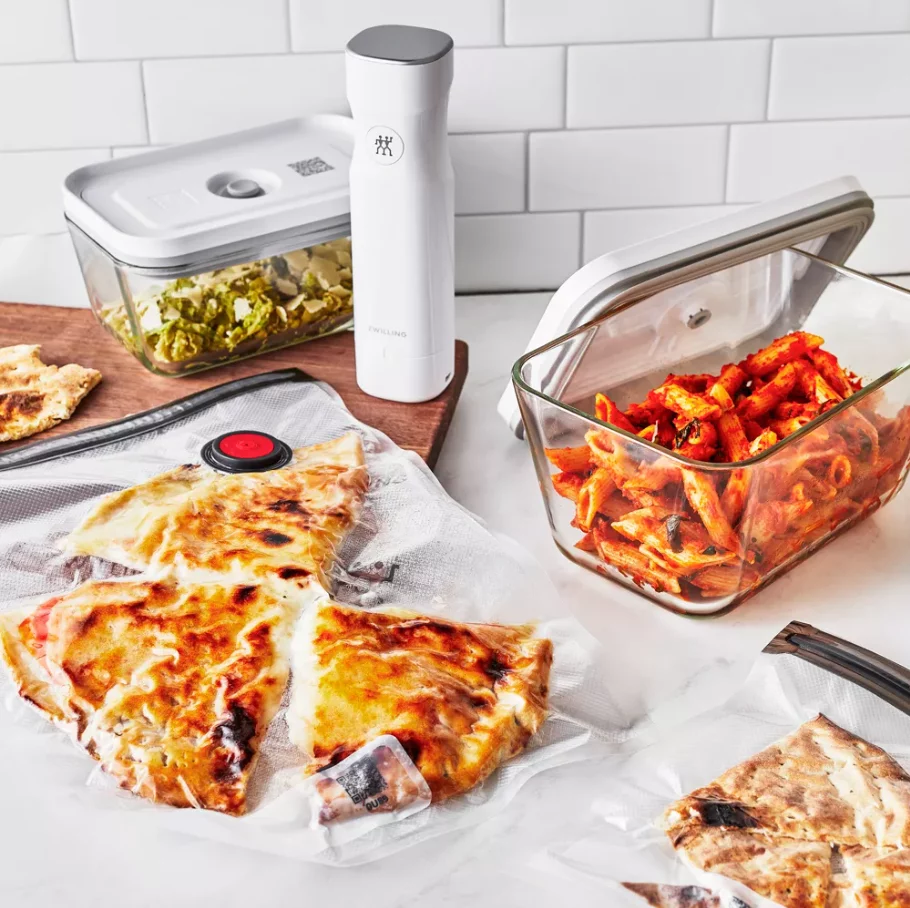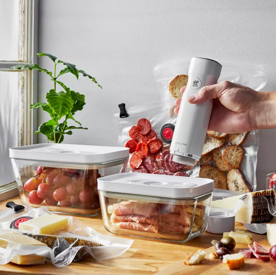 Eat healthier, save time, and store your food with long-lasting freshness with the new vacuum storage system: Fresh & Save. The exclusive Fresh & Save technology preserves flavors and nutrients, prevents freezer burn, and keeps food fresh up to five times longer than non-vacuum storage methods. Blending the power of a countertop vacuum sealer with the versatility of a handheld device, the cordless vacuum pump is fast, quiet, and easy to use. And thanks to its compact design, it will fit into any kitchen. We currently offer two starter sets available with vacuum pump, reusable BPA-free bags that are easy to close with a zipper attachment and are ideal for sous-vide cooking and microwave reheating, and either borosilicate glass or BPA-free polypropylene plastic containers. With the ZWILLING double sealing effect (most others only seal one surface) the containers shut tightly for super-fresh food. What’s more? The downloadable Culinary World app will track when you store food and when it will spoil, helping you to reduce food waste and save money. For a smart way to store food, choose Fresh & Save.