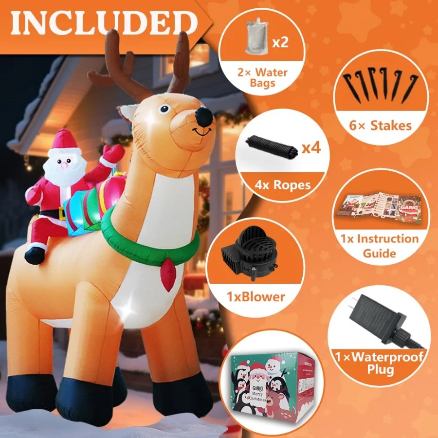 Inflatable Christmas Decorations:GARIG 10FT tall Christmas inflatable decoration is the perfect accent for winter Christmas events and Christmas parties. Featuring Santa Claus riding a cute reindeer surrounded by numerous Christmas gifts, it creates a strong festive atmosphere.