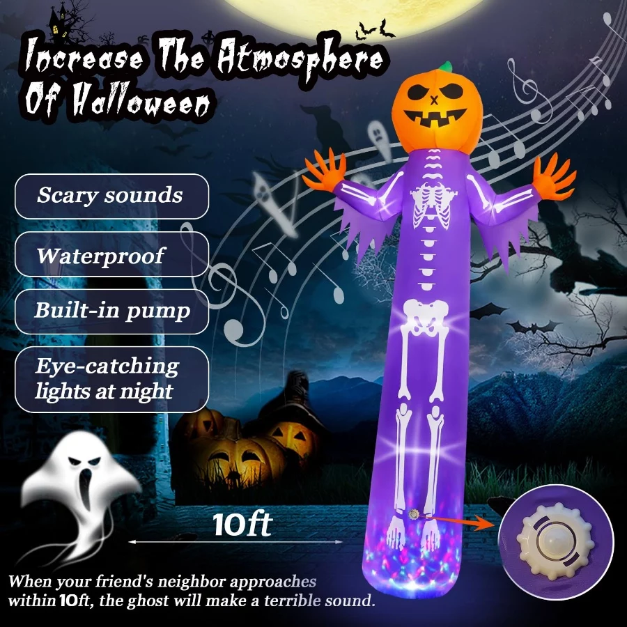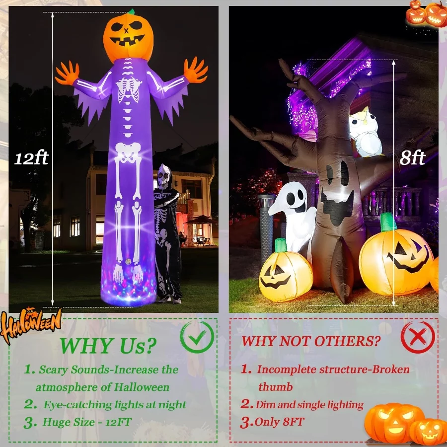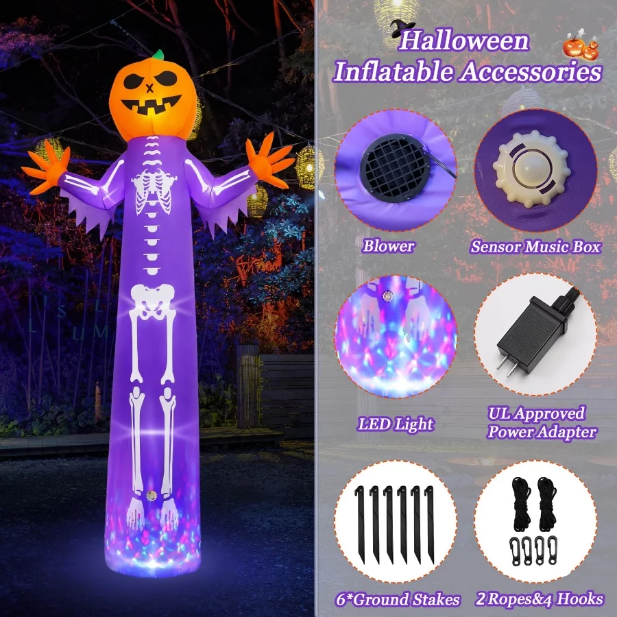 Giant 12FT Halloween Inflatable Pumpkin Skeleton with LEDs & Scary Music, Outdoor Blow Up Decoration for Yard Lawn Garden