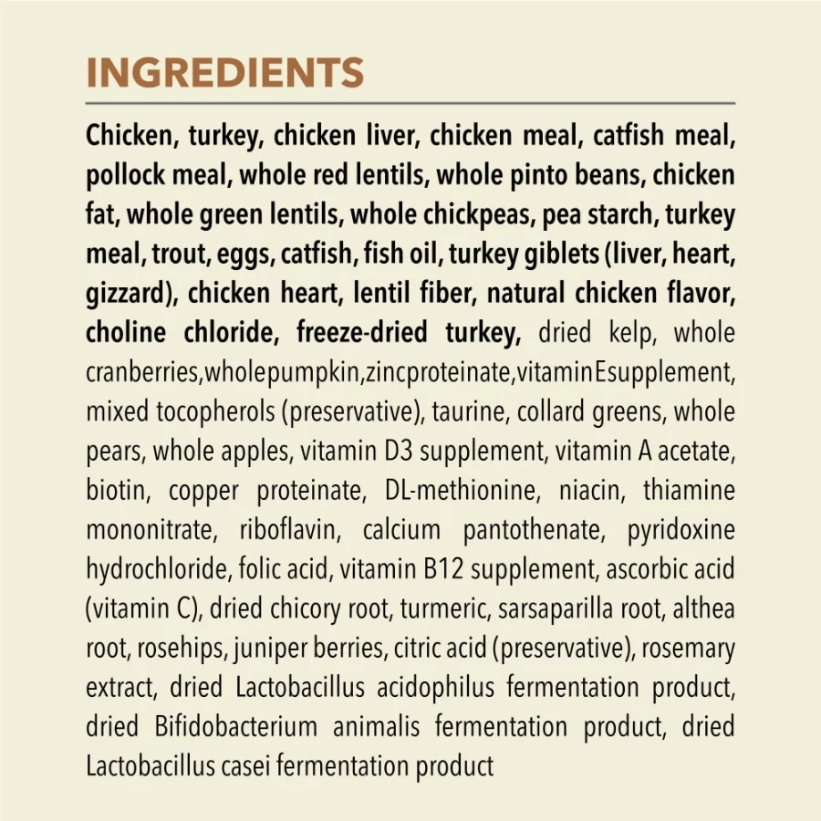 This grain free dry cat food recipe begins with free run chicken, turkey, and chicken liver, providing 75 percent animal based ingredients for the rich, protein focused taste cats naturally crave. The formula contains no artificial colors, flavors, or preservatives, offering clean and wholesome daily nutrition. A blend of probiotics and fiber supports healthy digestion, while taurine, EPA, and DHA help maintain strong heart function and clear vision. Balanced with fruits and vegetables that supply natural antioxidants, this recipe also provides omega 3 and omega 6 fatty acids to promote soft skin and a shiny coat. Made in the USA using carefully sourced global ingredients, it delivers complete nourishment for everyday feline health.
