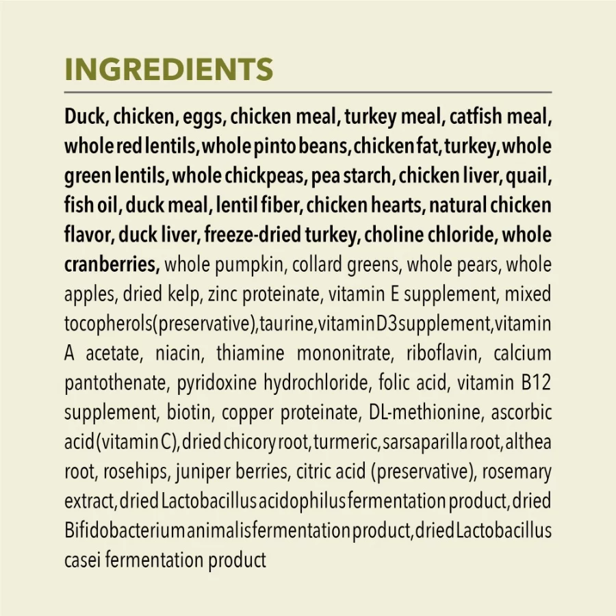 This grain free dry cat food recipe begins with duck, free run chicken, turkey, and eggs, providing 75 percent animal based ingredients for the rich, protein focused flavor cats naturally crave. The formula contains no artificial colors, flavors, or preservatives, offering clean and wholesome daily nutrition. A blend of probiotics and fiber helps support healthy digestion and gut function, while taurine, EPA, and DHA contribute to strong heart function and clear vision. Balanced with nutrient dense fruits and vegetables, this recipe also supplies omega fatty acids that promote soft skin and a shiny coat. Made in the USA using carefully sourced global ingredients, it offers complete nourishment for everyday feline health.