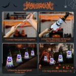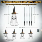 PACKAGE INCLUDES: 4 ghosts wearing witch hats, equipped with 4 fiberglass poles with a length of 24 inches, and a total length of 8.8 feet of colorful LED string lights. Each ghost is 2.3 feet apart and powered by three batteries (batteries not included)
