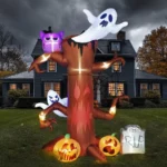 Scary Halloween Inflatables Tree :Create a spooky party scene with this inflatable scary tree. 8FT tall Halloween inflatables with ghosts, owl, spider web, pumpkin, and tombstone, like having a party on the tree. It’s the Perfect decor for Ouside Halloween party.