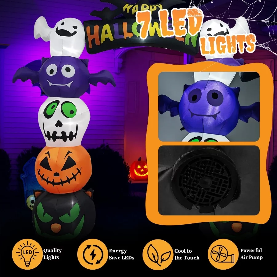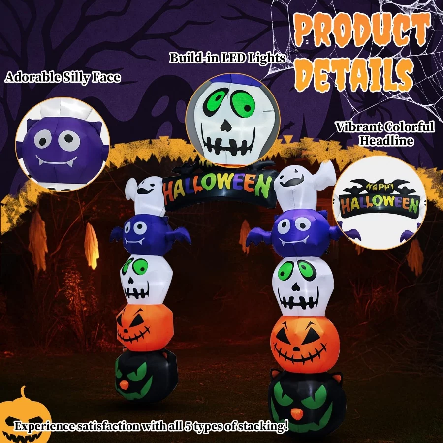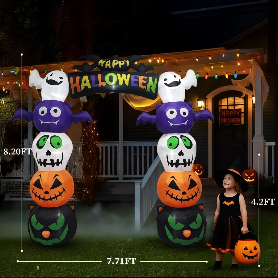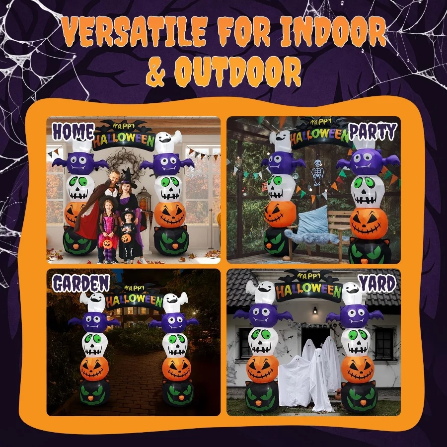 Towering 8.2FT Pumpkin Archway: This giant inflatable arch with stacked pumpkin and ghost makes an unforgettable entrance for your Halloween yard, party, or walkway display.