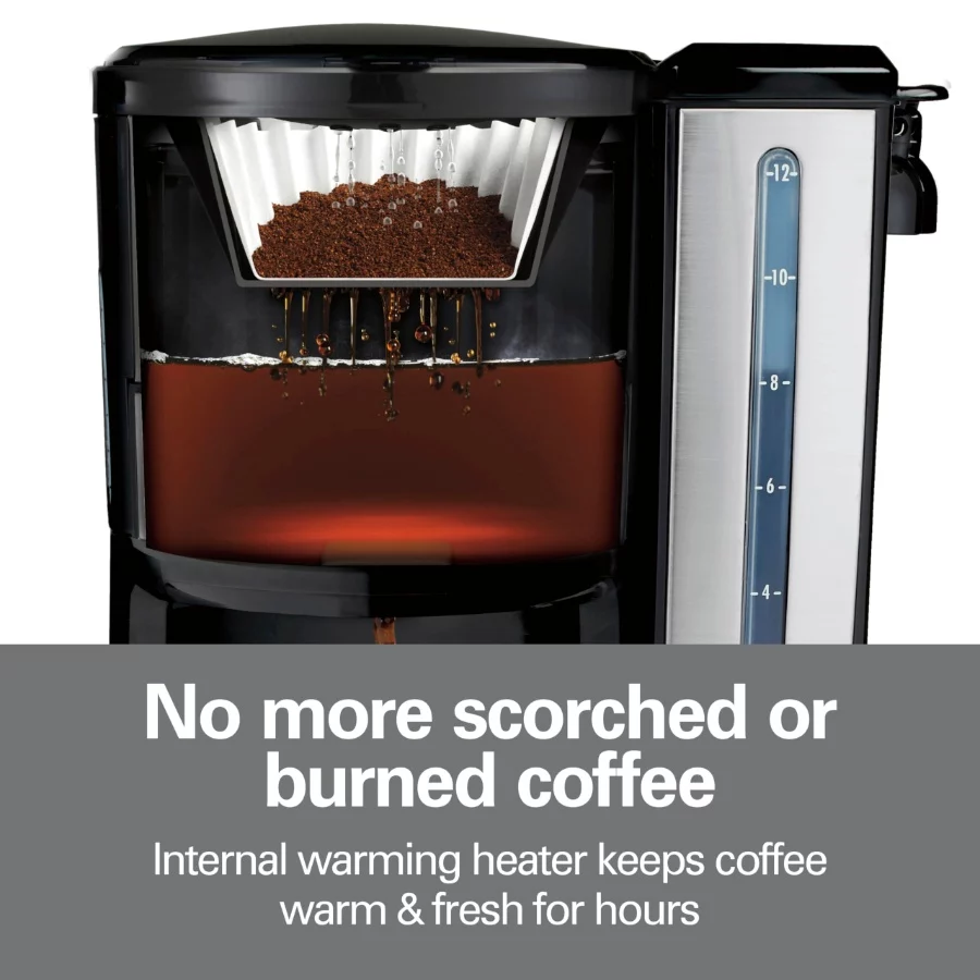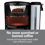 NO MORE SCORCHED OR BURNED COFFEE: The Hamilton Beach coffee maker’s internal warming heater keeps coffee warm and fresh for hours. It works without a carafe, so coffee won’t burn or scorch.