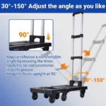 Adjustable Three-Stage Soft Rubber Handle: The button can easily adjust the height of the handle(22.25” to 40.55”). The angle can be switched at will between 30° and 150°. The Hand Truck’s soft rubber grip feels soft and comfortable, and you won’t feel tired even if you hold it for a long time.