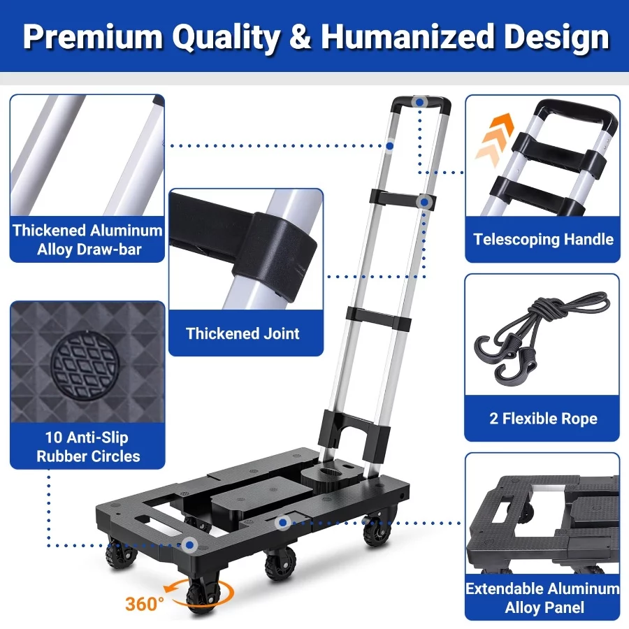 Heavy Duty Folding Hand Truck Dolly 600LB Lightweight Utility Platform Cart with 7 Wheels, Brakes & Handle Lock for Moving.