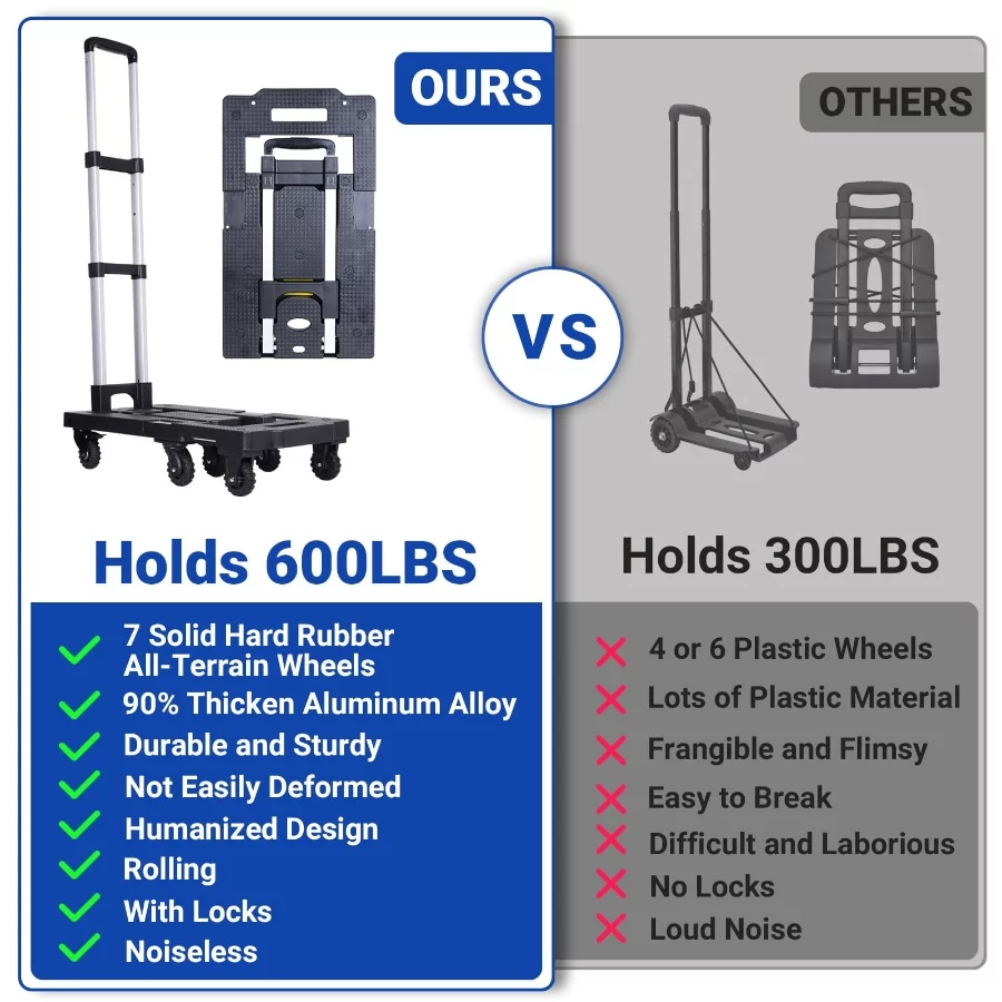 Heavy Duty Folding Hand Truck Dolly 600LB Lightweight Utility Platform Cart with 7 Wheels, Brakes & Handle Lock for Moving